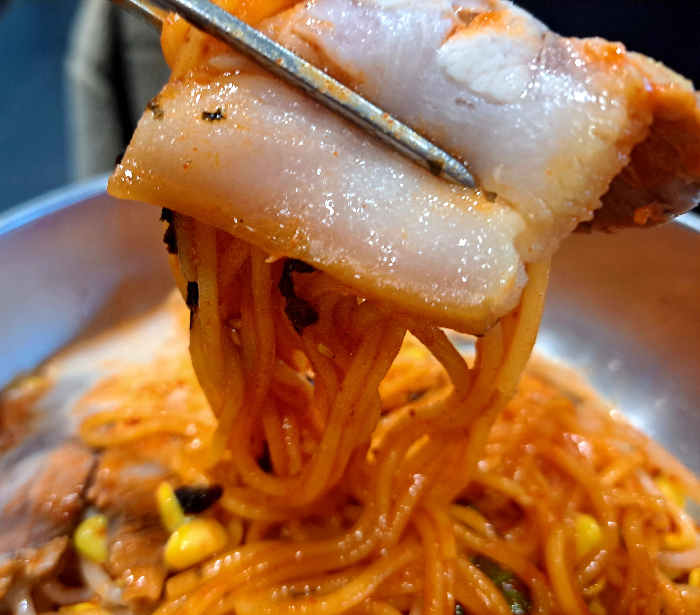 비빔국수는 살짝 매콤하면서 새콤한 쫄면 느낌의 고기와 함께 먹으니 정말 완벽한 조합이었습니다.