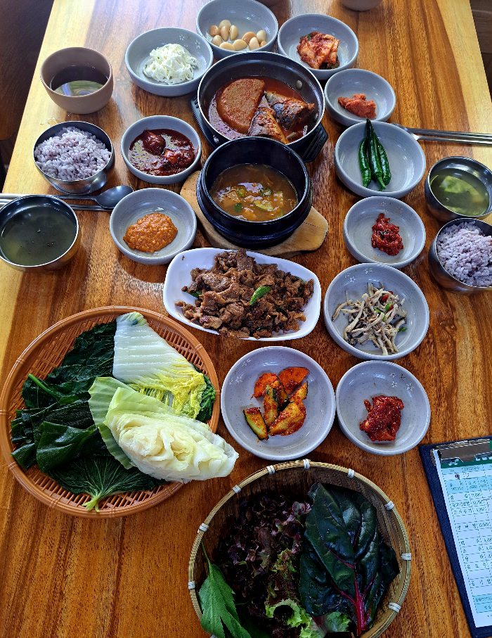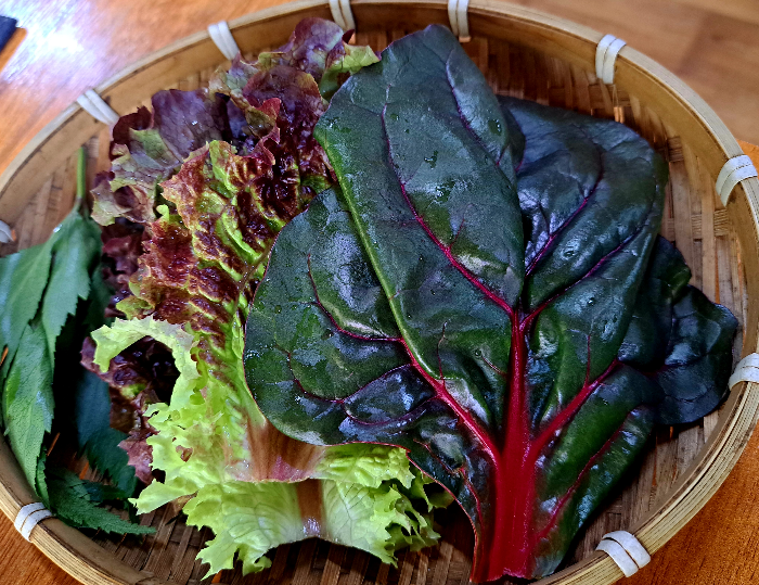 머위, 케일, 상추, 깻잎, 양배추, 고추, 근대 등 다양한 쌈이 나오니 너무 좋았습니다.