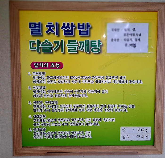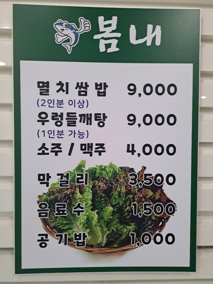 봄내에는 남해산 멸치를 먹기 좋게 뼈를 발라 손실한 칼칼한 멸치쌈밥과 국내산 우렁이 듬뿍 들어간 고소한 우렁들깨탕 두 가지 메뉴만 있습니다.
