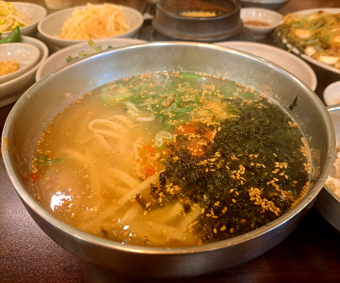 깔끔하고 개운한 맛의 육수에 김가루, 파, 깨가 고명으로 올라가 있습니다.