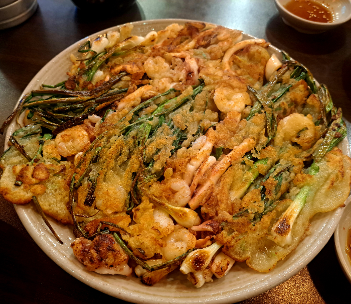 굵직한 오징어와 새우와 쪽파가 듬뿍 들어가 있어 파전은 밀가루 반죽이 아닌 감자를 갈아서 부친다고 합니다.