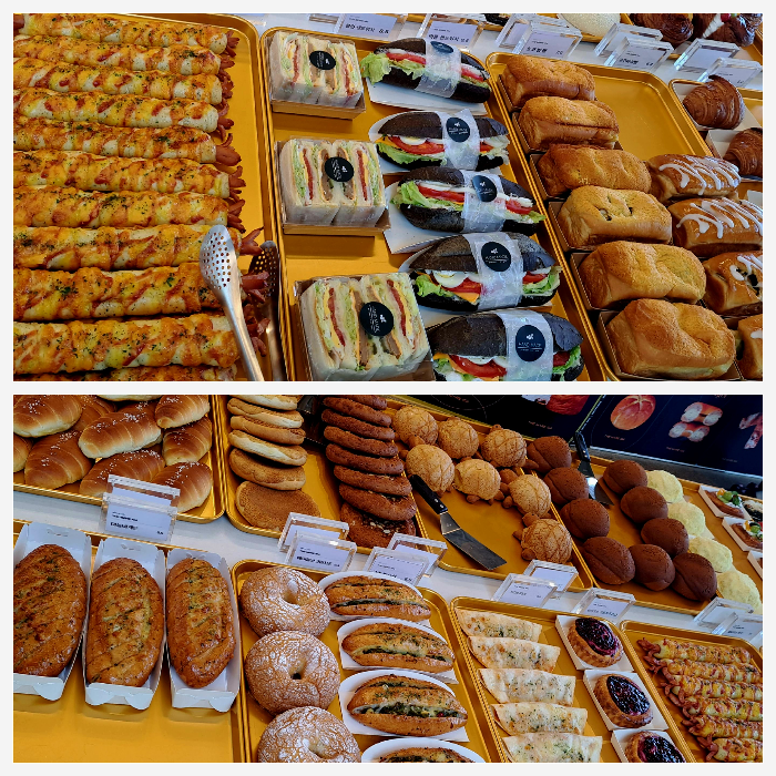진열대 가득 다양한 빵들이 진열되어 있습니다.
