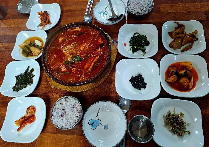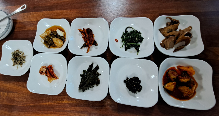새콤달콤 도라지, 견과류 잔뜩 바삭한 멸치볶음, 버섯어묵간장볶음, 장아찌, 김무침, 나물 등등 재료를 아끼지 않은 사장님의 정성들이 느껴지는 반찬들이었습니다.