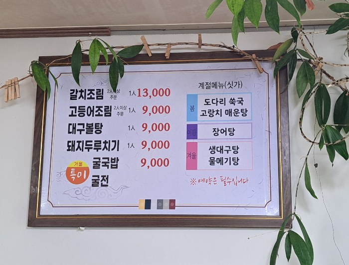 겨울특미로 굴국밥 /굴전과 계절메뉴로 봄도다리쑥국/고랑치매운탕/장어탕/생대구탕/물메기탕을 판매하고 있습니다.