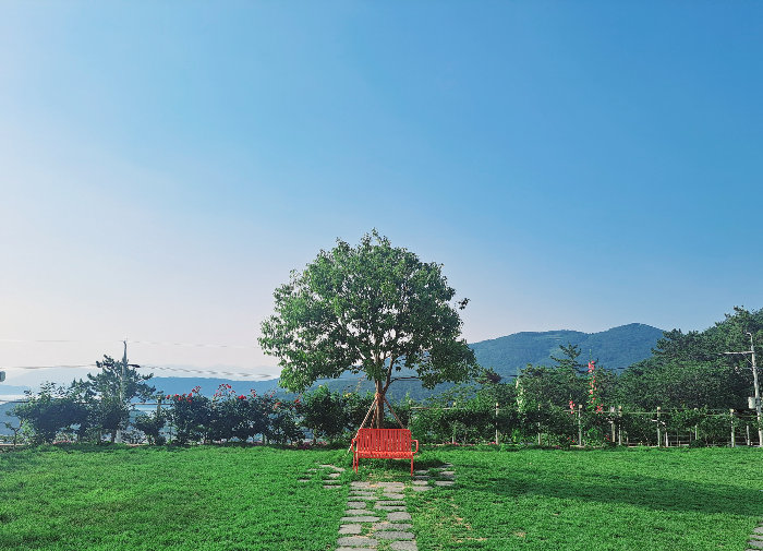 잔디 중앙에 큰 나무와 빨간 벤치가 있어서 사진 찍기도 좋은 곳입니다.