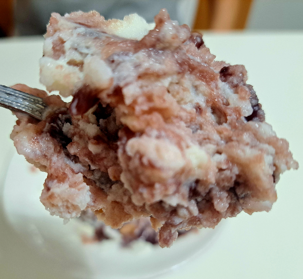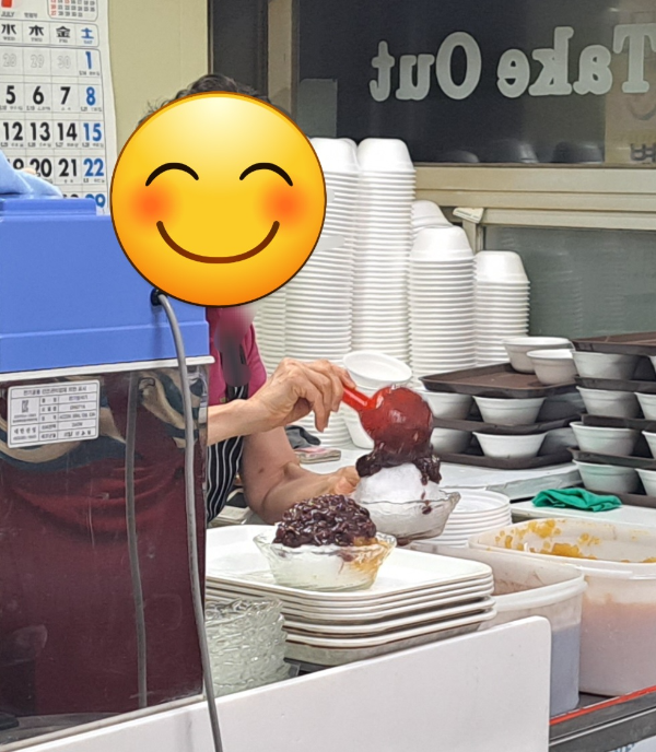 우유얼음에 삶은 통팥과 수제 사과잼을 넣어서 더 달콤하고 부드러운 맛이었습니다.