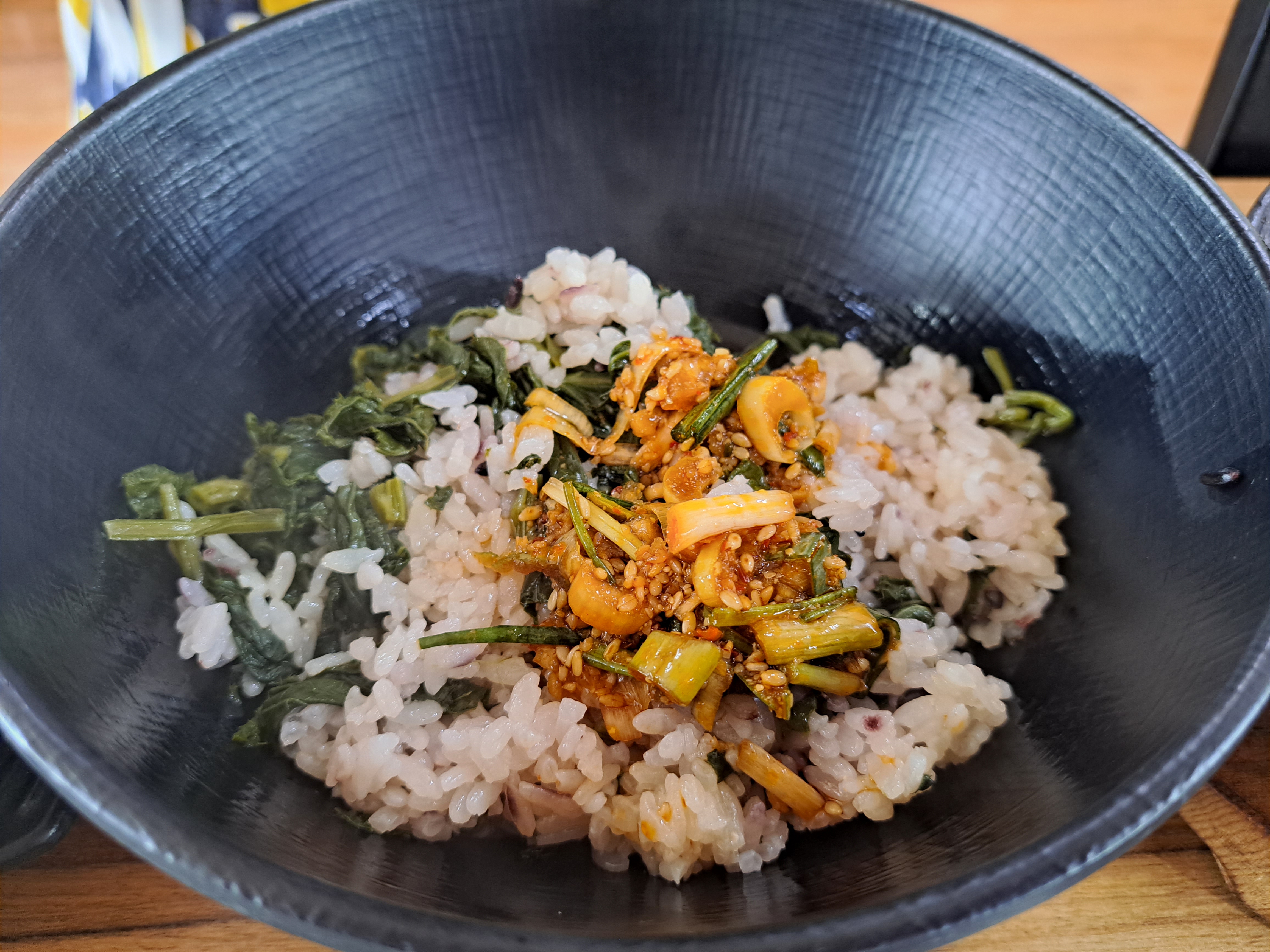 돌솥밥은 갓 지은 찰진 흑미밥에 은행과 콩이 들어가 있습니다.