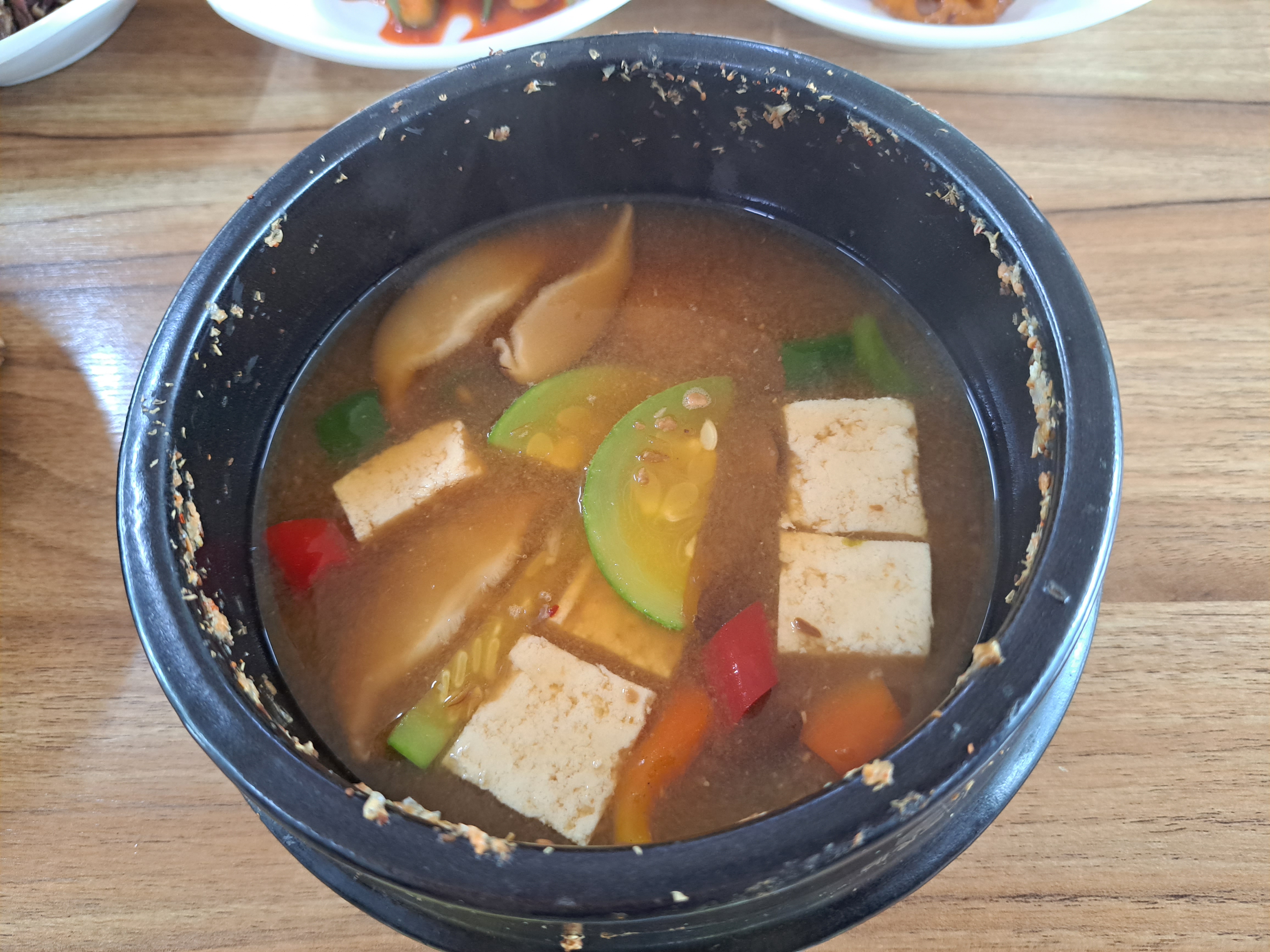 고추, 버섯, 두부, 호박이 들어가 있는 된장찌개는 시골된장찌개 느낌의 구수한 맛이었습니다.