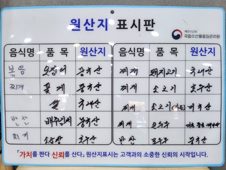 거제도 상동 일품 순두부 메뉴입니다.