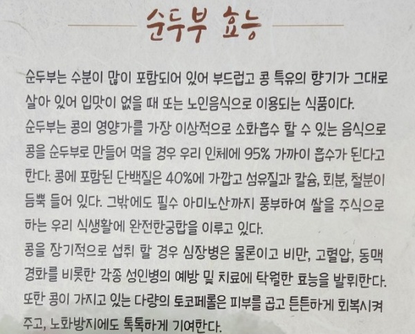 순두부는 심장병은 물론이고 비만, 고혈압, 동맥경화를 비롯한 각종 성인병 예방 및 치료에 탁월한 효능이 있다고 합니다.