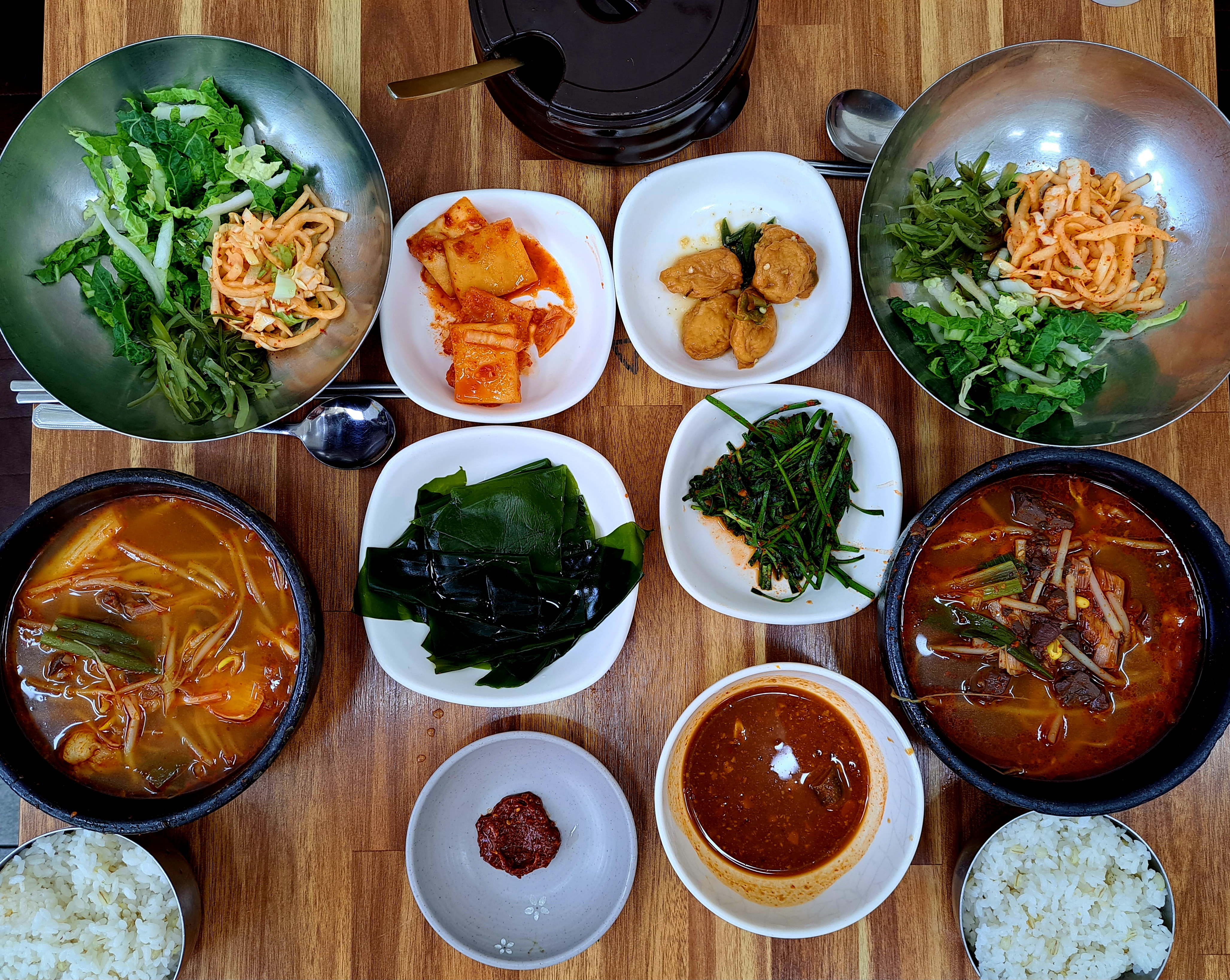 뚝배기에 먹음직스러운 선짓국과 나물 비빔밥이 나오고 반찬은 비빔강된장, 깍두기, 어묵볶음, 다시마, 부추무침등 이 나옵니다.