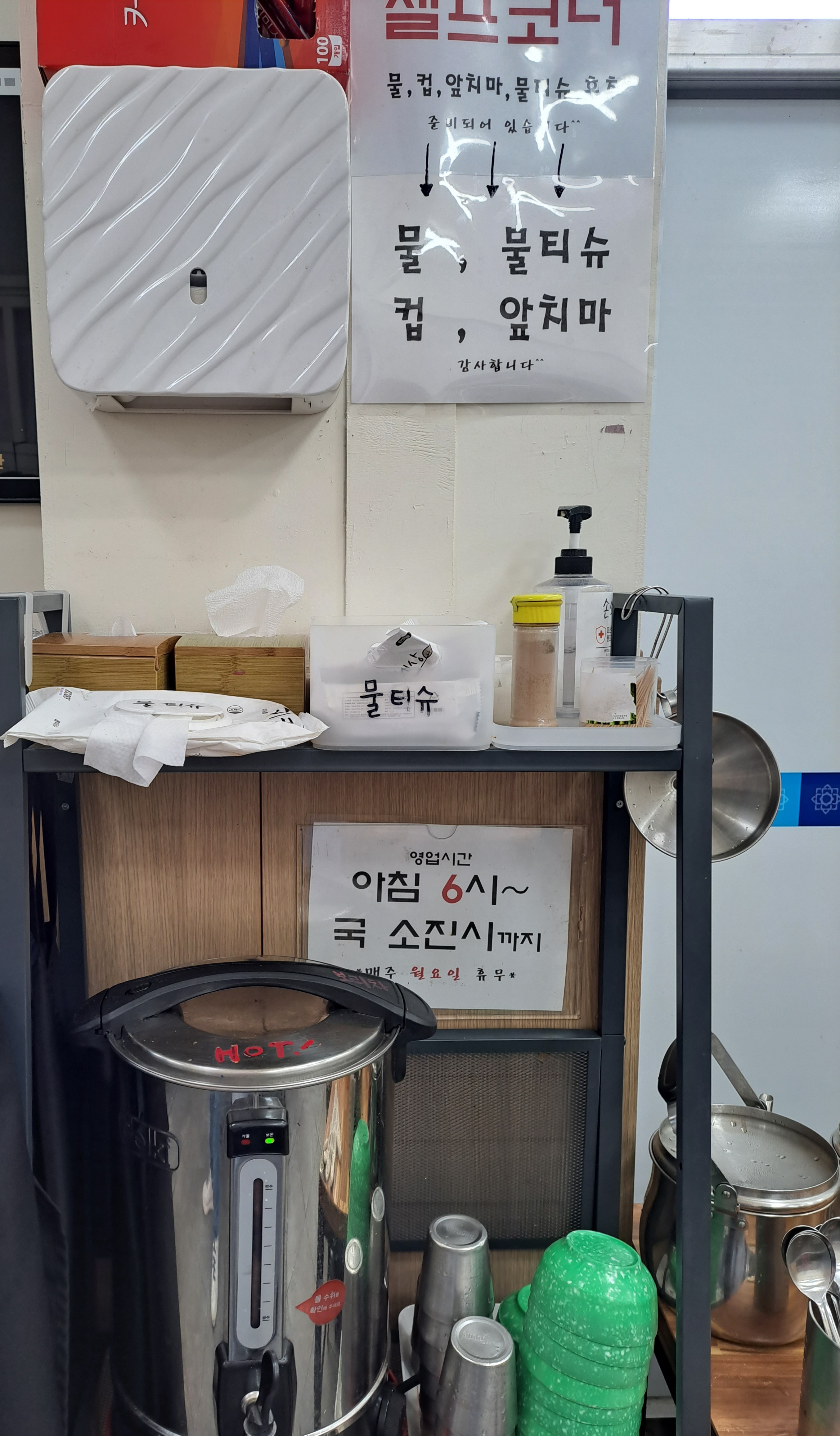 물, 물티슈, 컵, 앞치마는 셀프 코너에서 직접 가져오시면 됩니다.