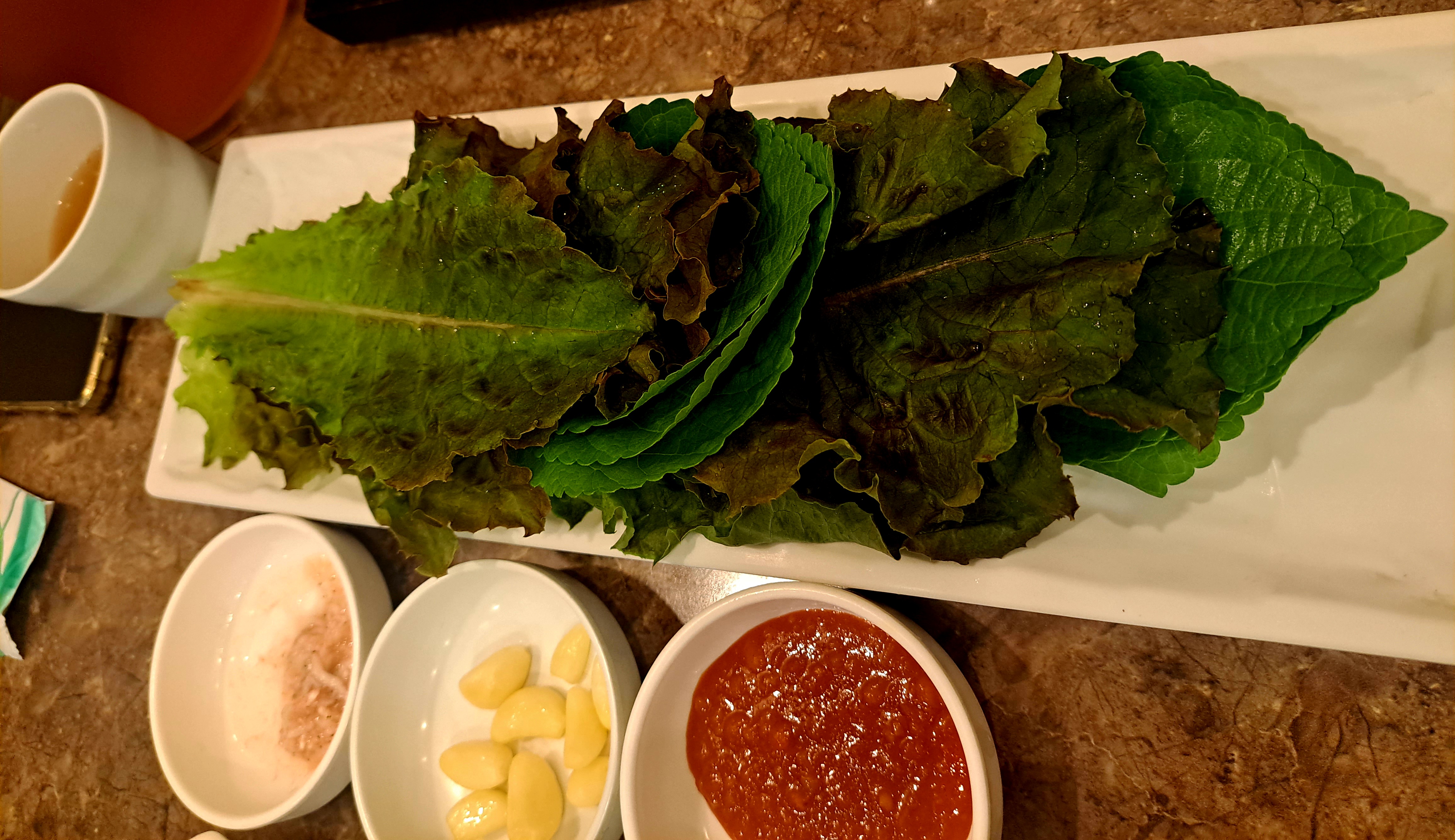 보쌈 야채는 깻잎, 상추, 마늘, 쌈장, 새우젓이 나옵니다.