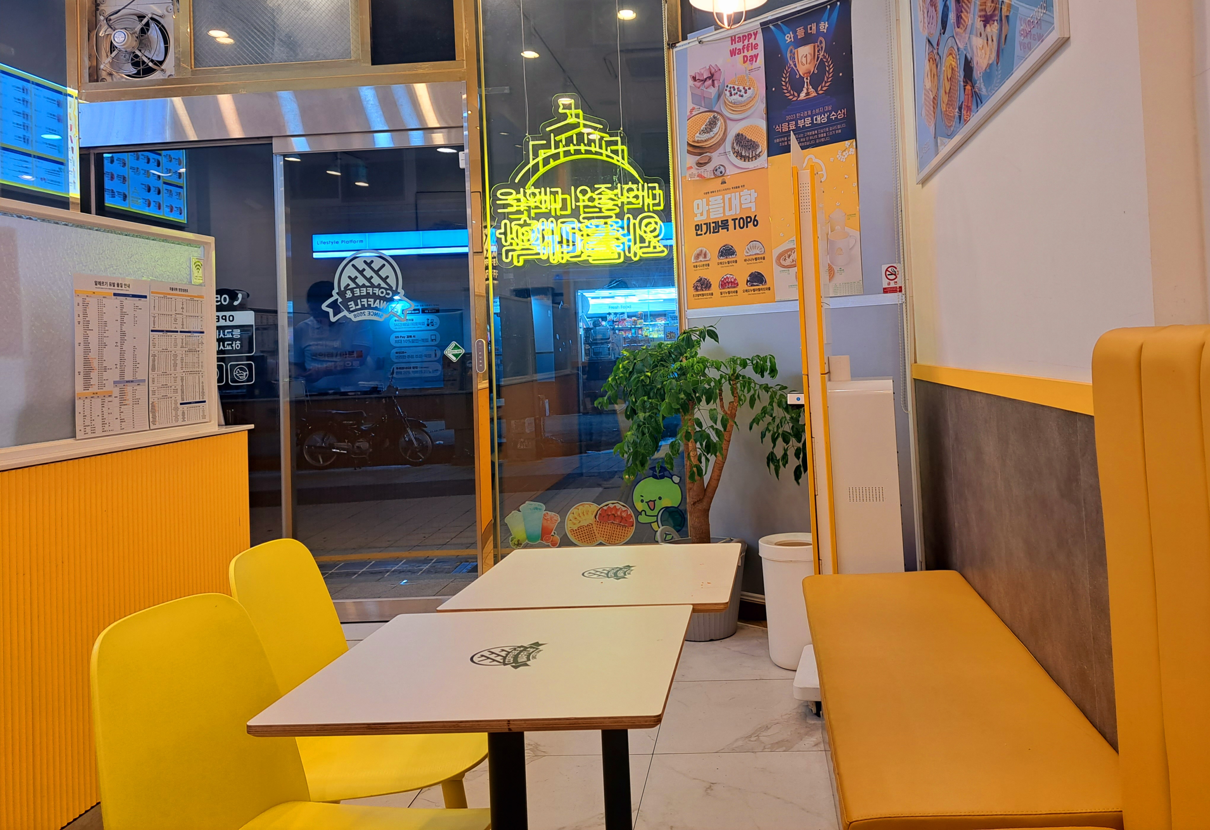 깔끔한 실내에 노란색 의자들이 와플대학과 너무 잘 어울리는 풋풋한 인테리어였습니다.