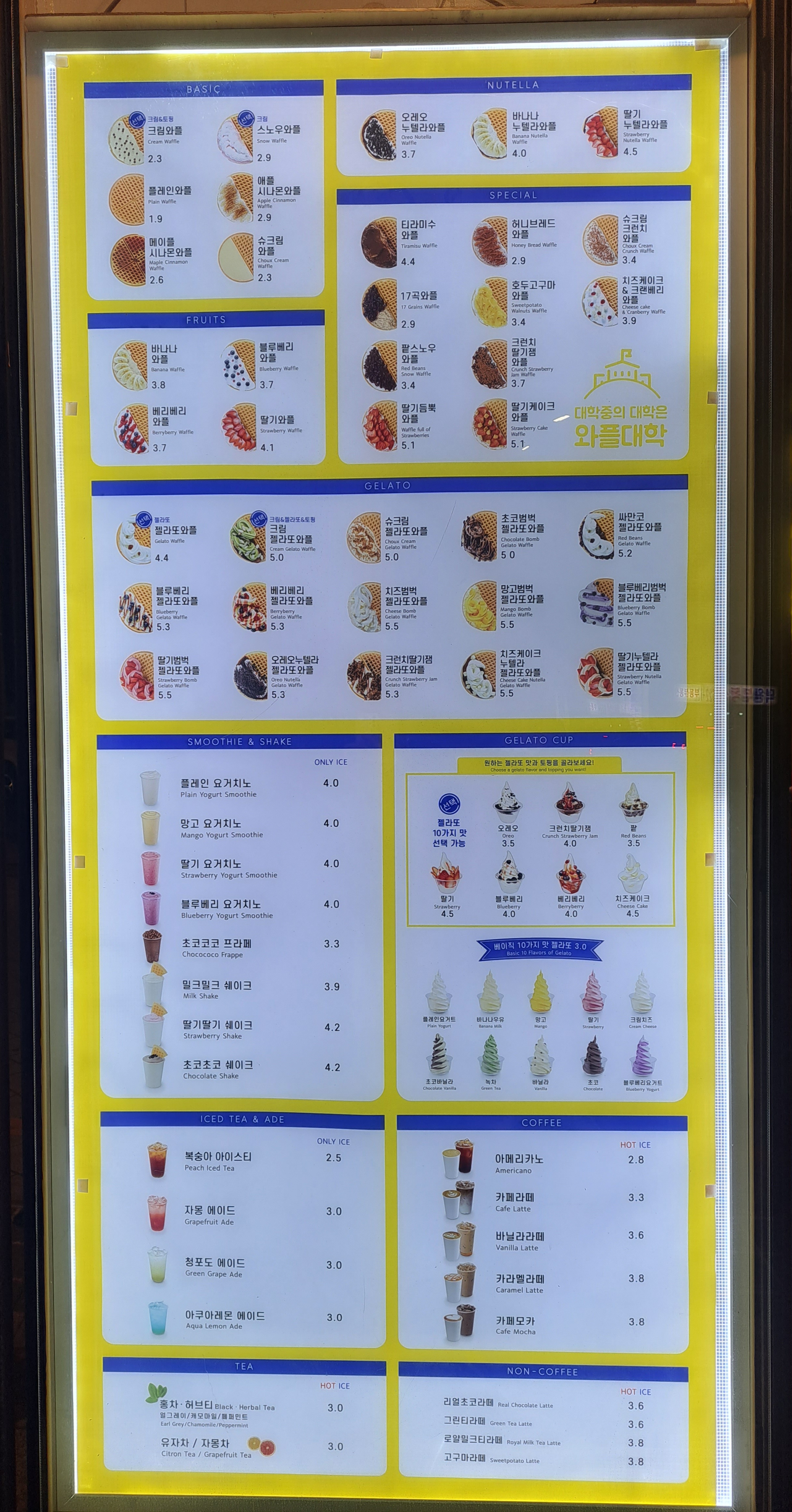 와플대학의 메뉴는 크림이 올라간 기본 와플부터 아이스크림이 올라간 와플, 아이스크림, 커피, 음료 등 다양한 메뉴들이 준비되어 있습니다.