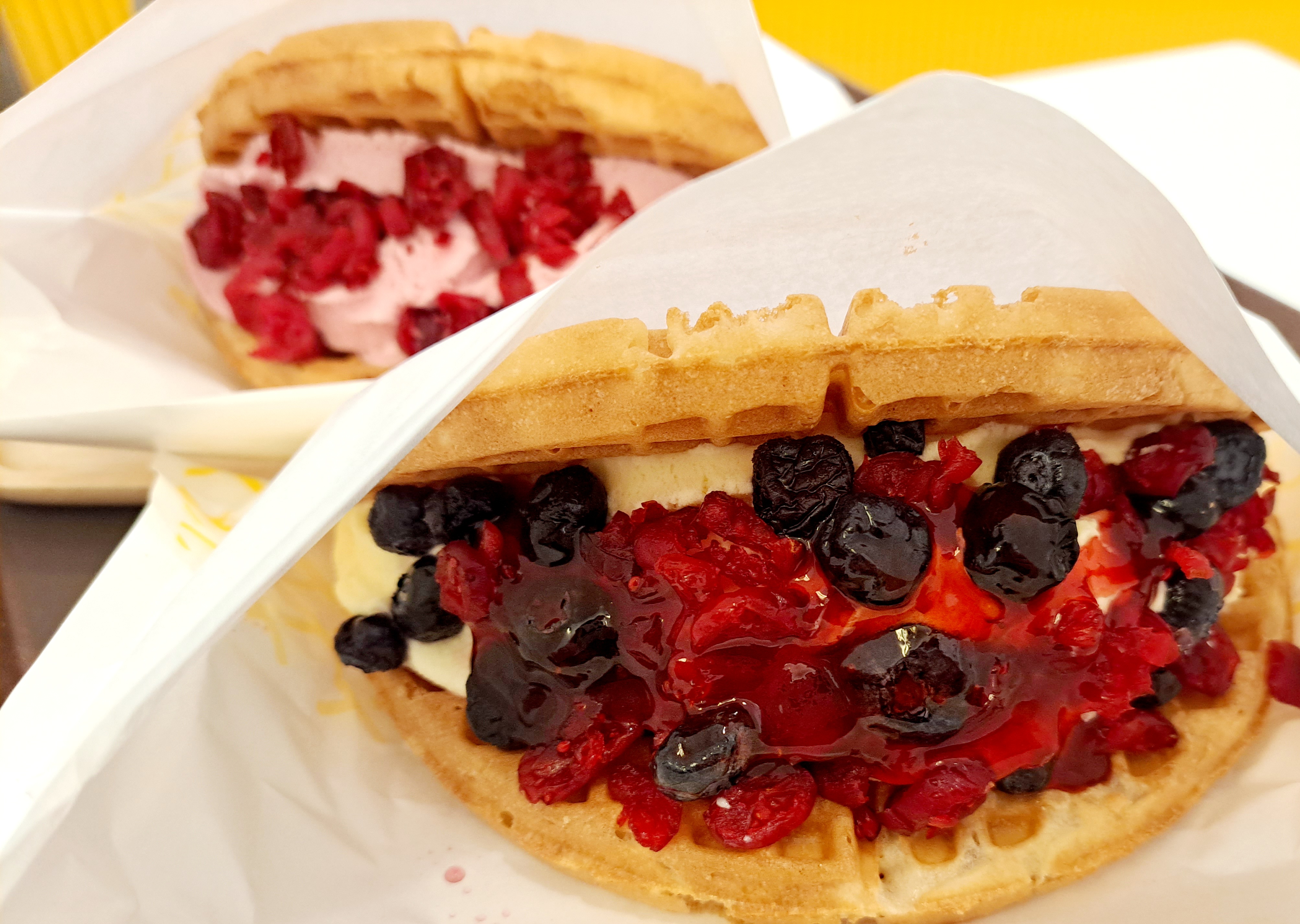 부드러운 바닐라 아이스크림에 블루베리와 크랜베리의 토핑이 잘 어우러져 씹는 식감도 좋고 바삭한 와플 빵과 함께 먹으니 너무 맛났습니다.