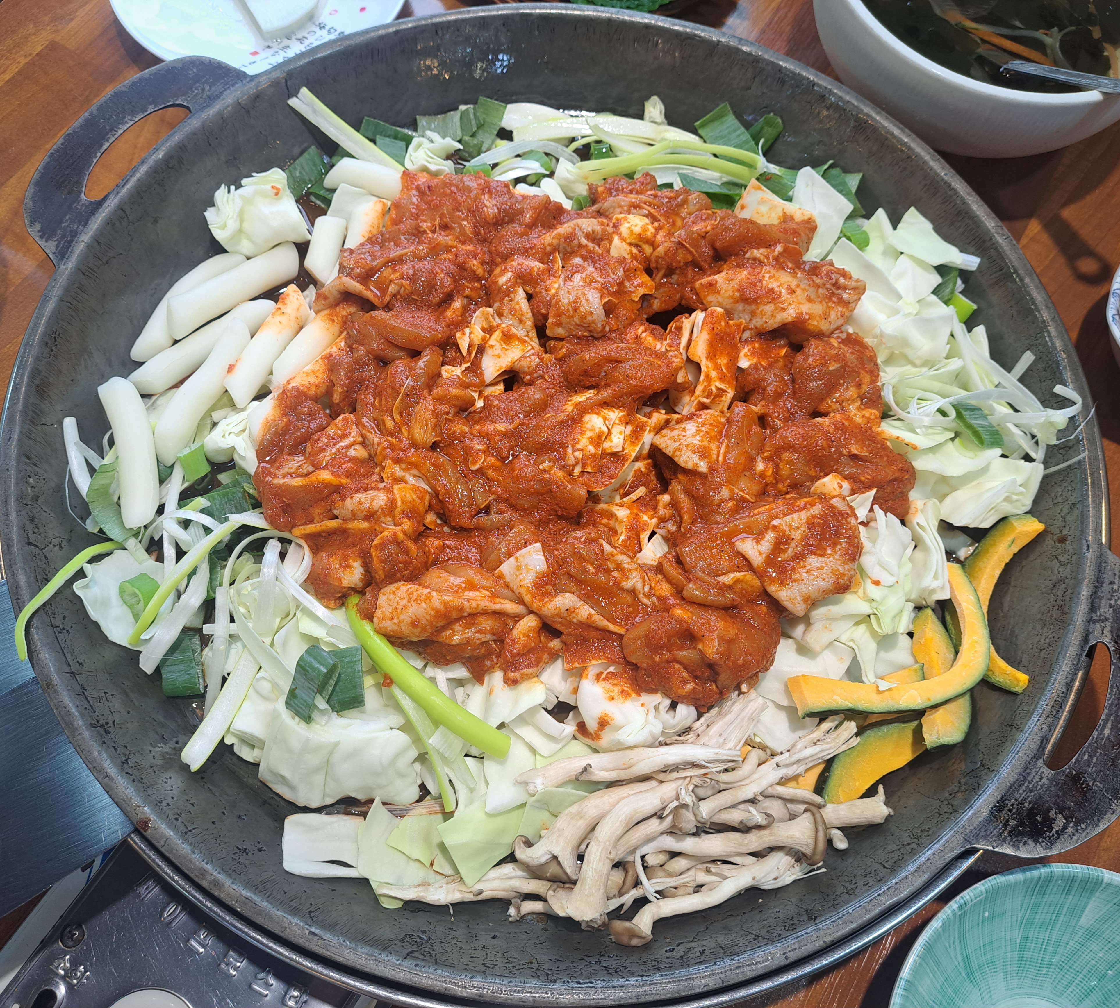 닭갈비는 양도 많은데 버섯, 떡, 양배추, 단호박등 야채들도 많이 들어 있어서 정말 푸짐하게 드실 수 있습니다.