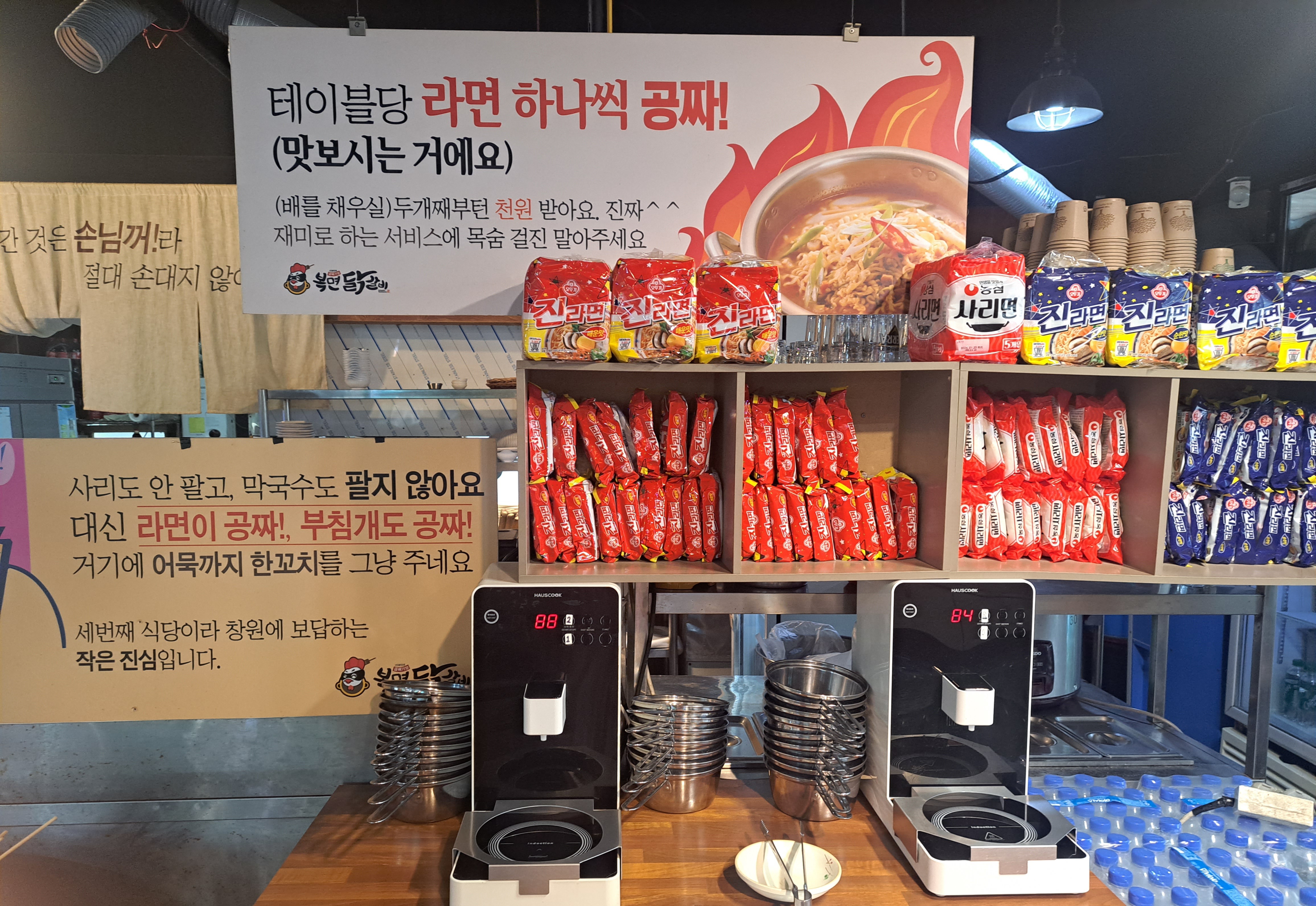 이곳은 셀프 라면존으로 테이블당 라면 하나씩 공짜입니다.