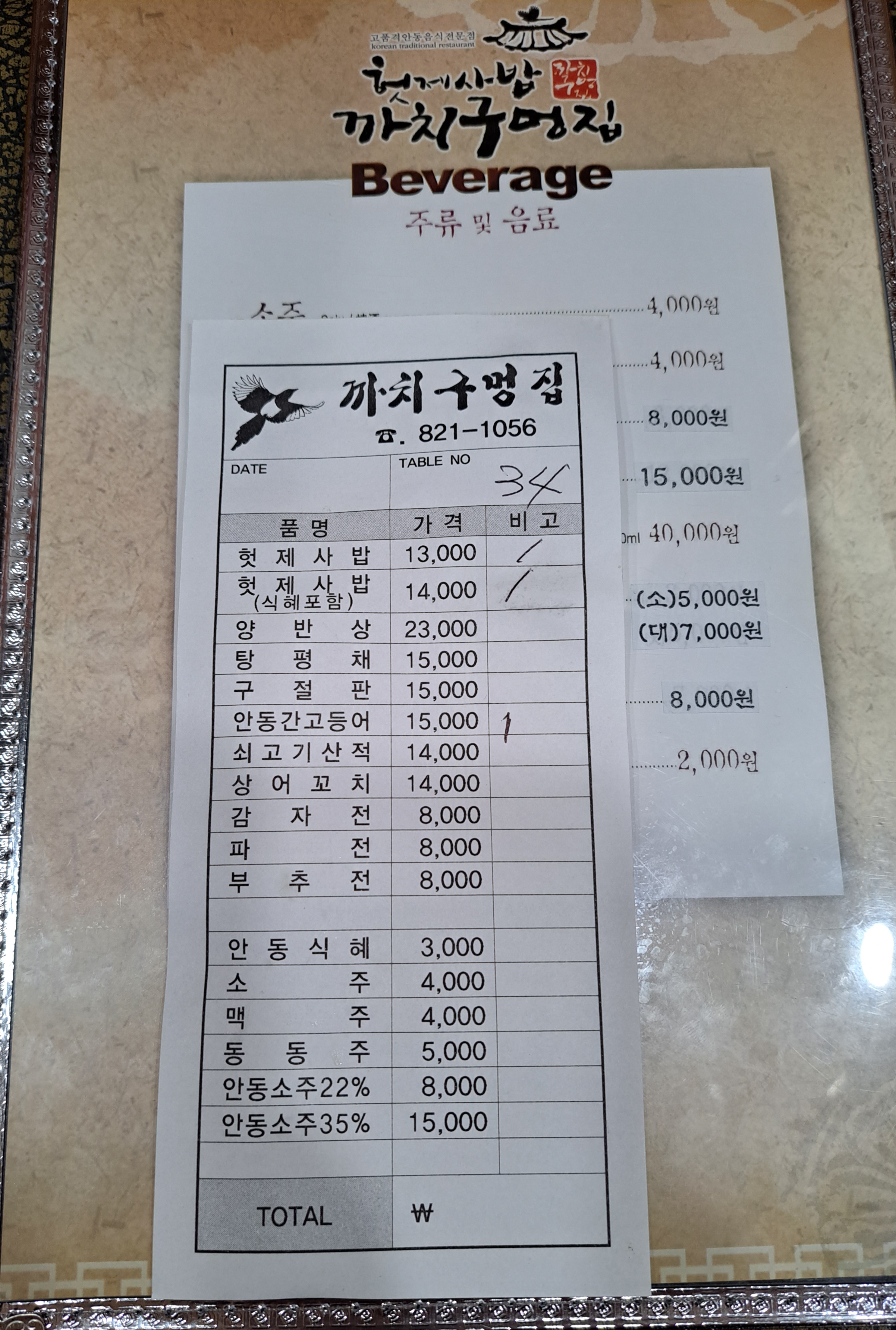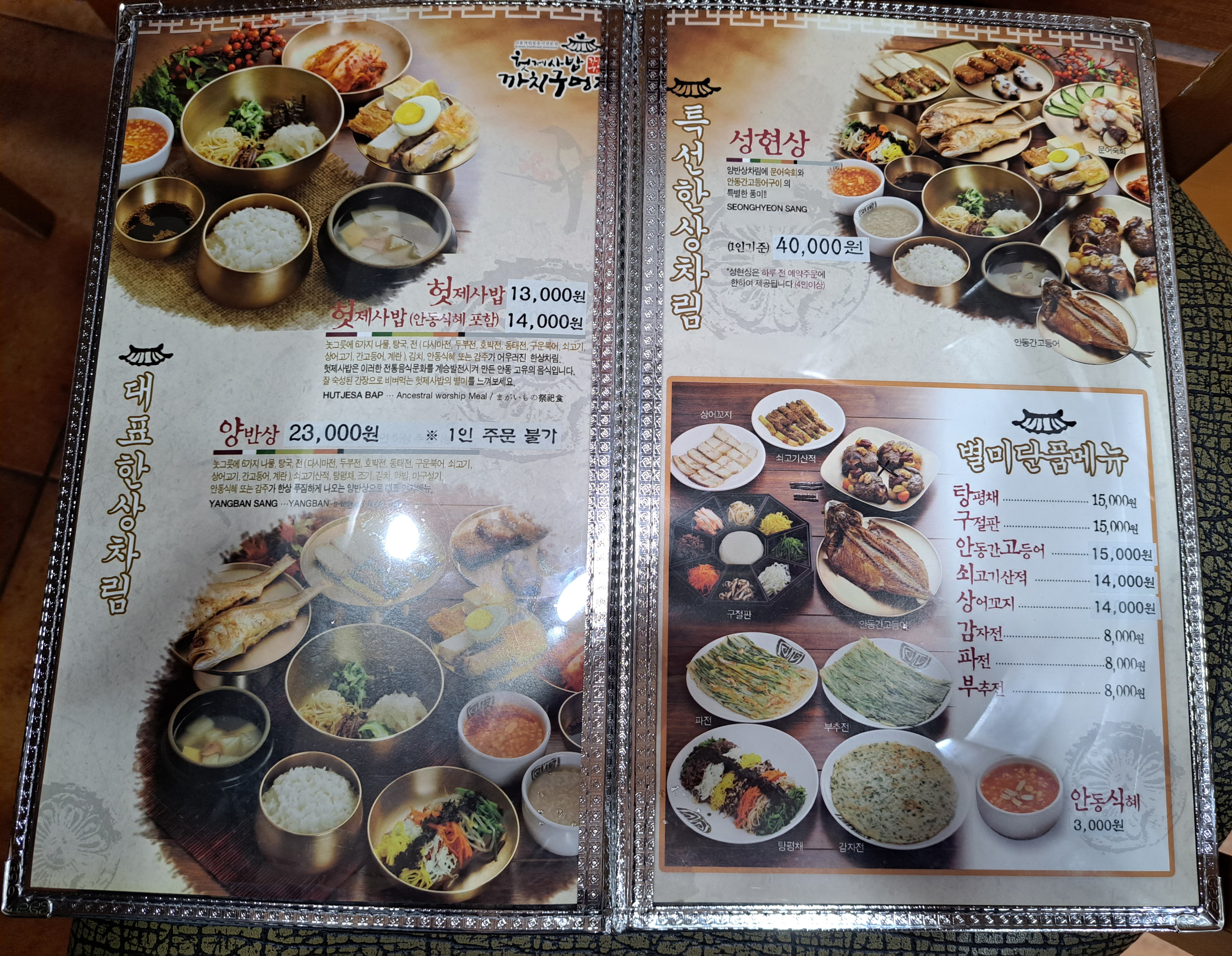 헛제삿밥 까치구멍집의 메뉴판입니다.