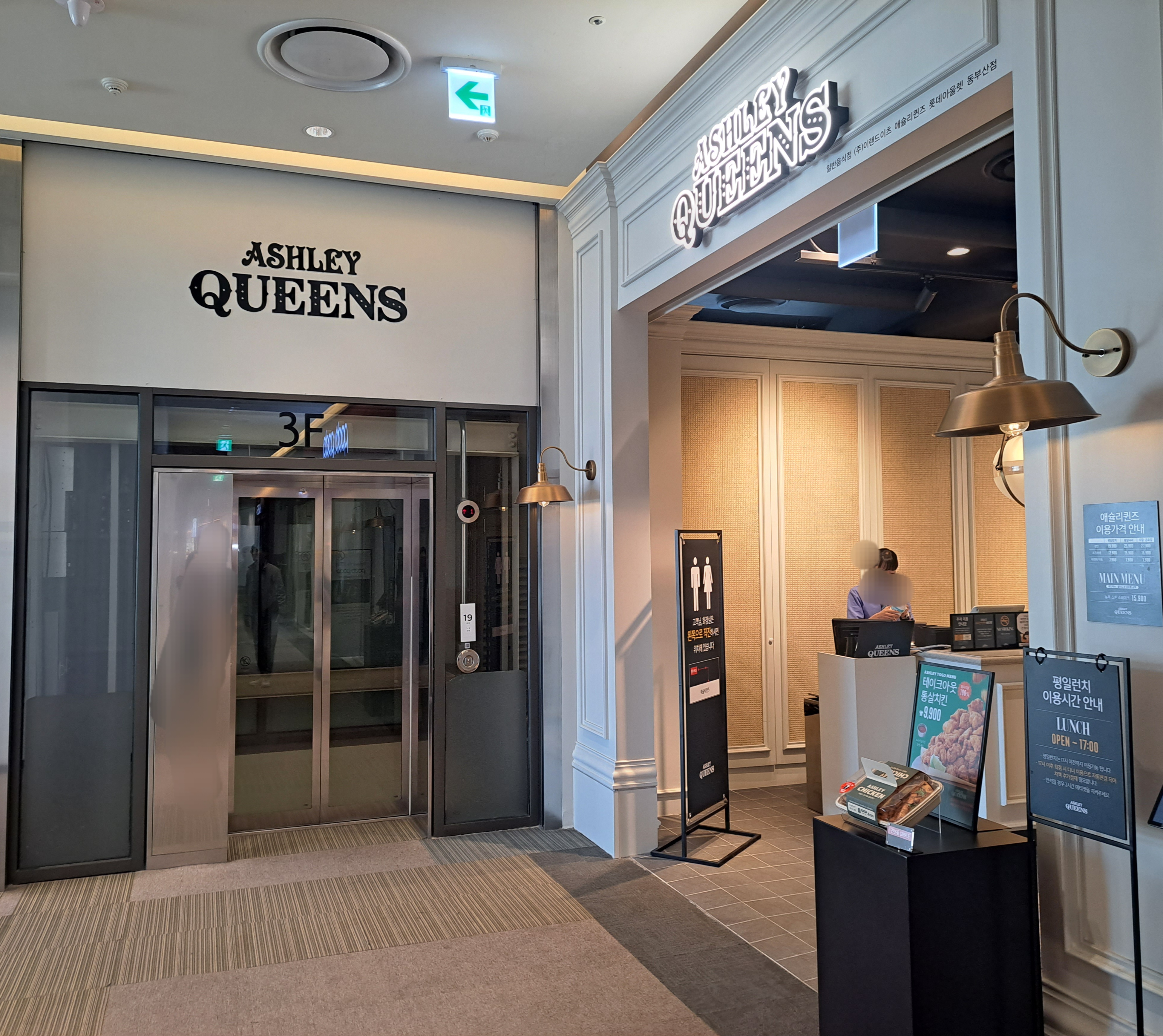 애슐리 퀸즈 동부산점은 쇼핑몰 3층 맨 끝에 위치해 있습니다.