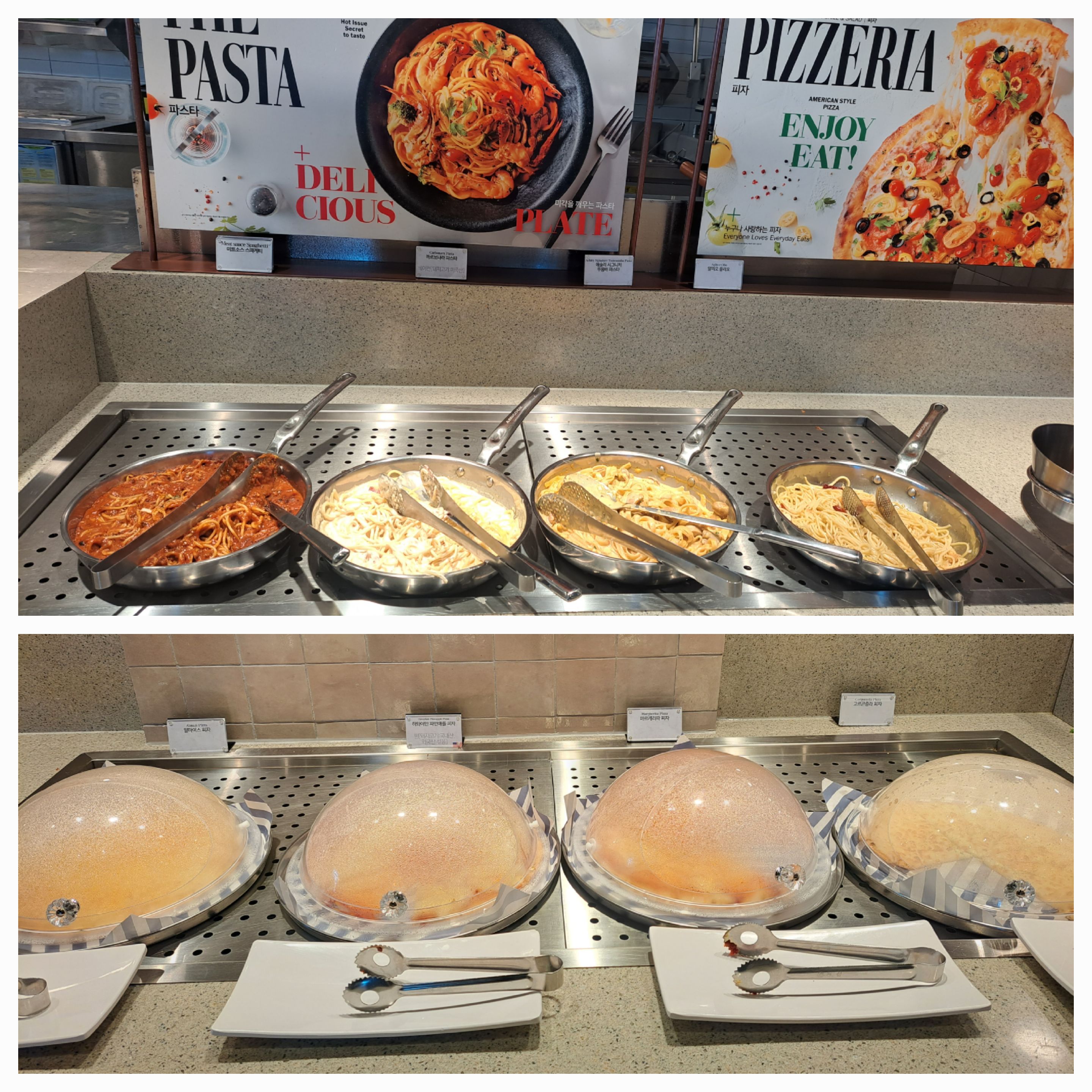 네 가지 파스타와 네 가지 피자가 있어서 취향껏 즐기실 수 있습니다.
