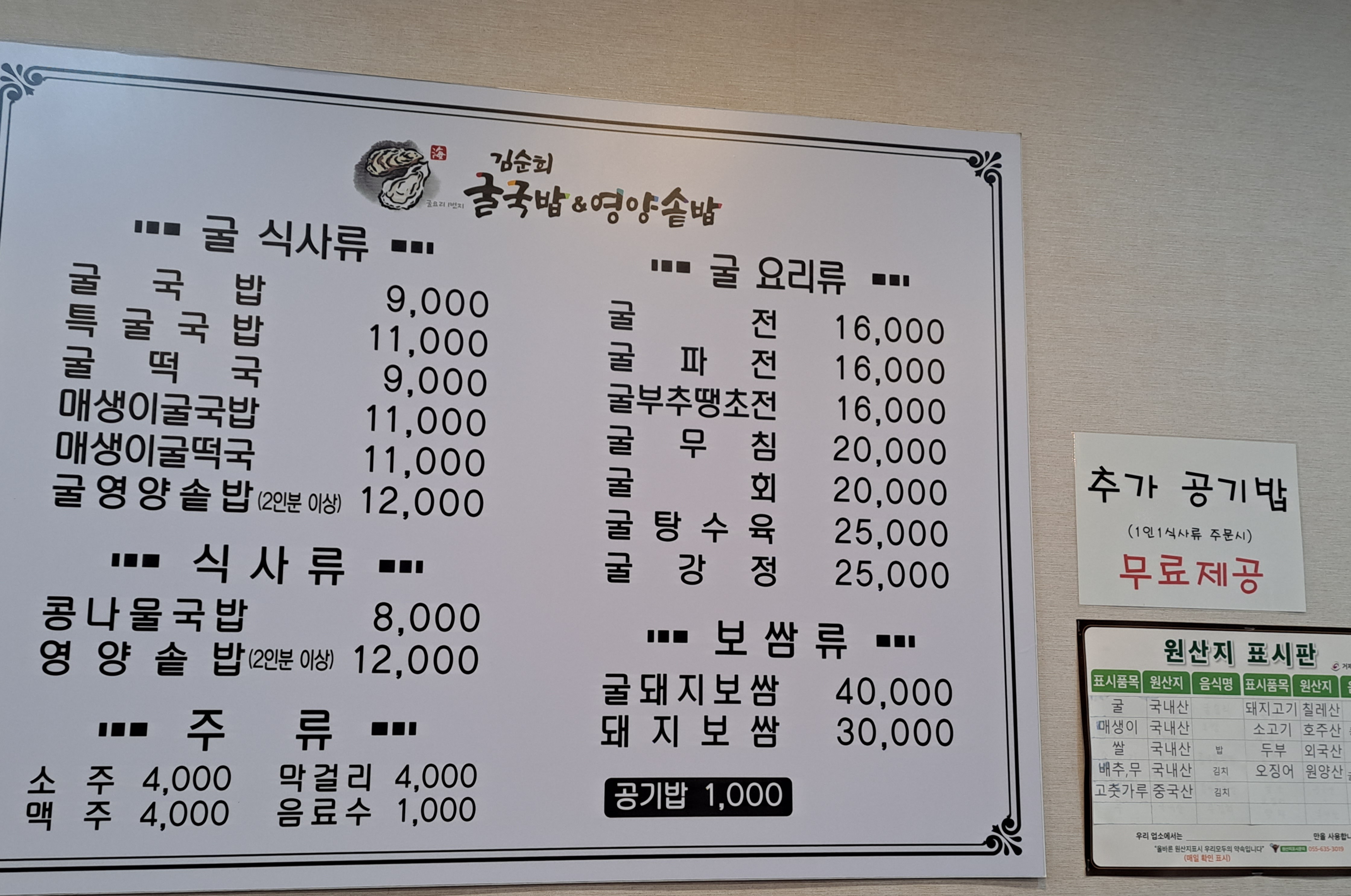 식사류는 굴국밥/특굴국밥/굴떡국/매생이굴국밥/매생이굴떡국/굴영양솥밥(2인이상)등이 있습니다.