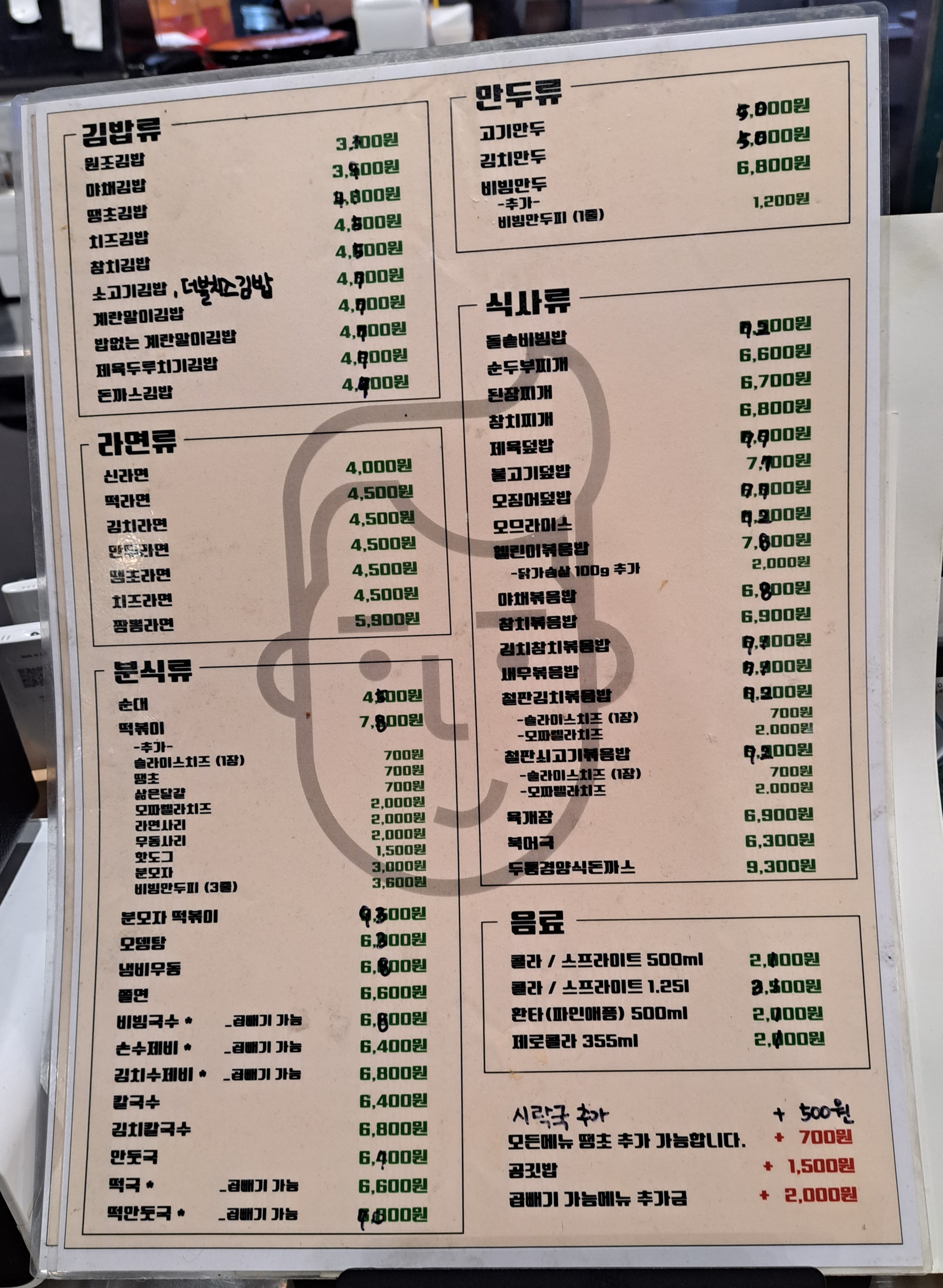 김밥류/라면류/분식류/만두류/식사류로 구분이 되어 있습니다.