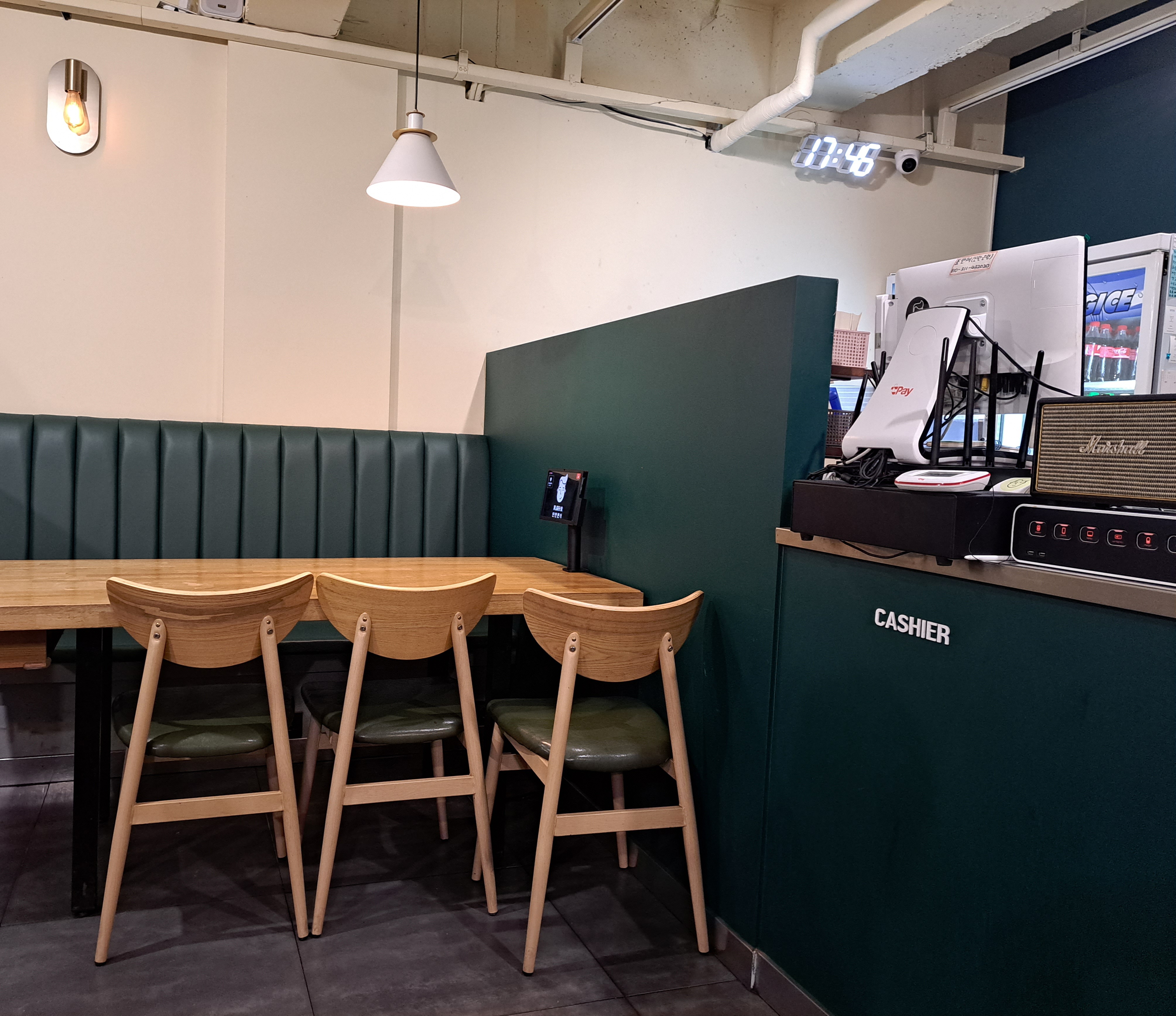 만만분식의 내부는 넓고 깔끔한 초록초록한 인테리어에 혼밥이 가능한 테이블부터 4인,6인 다양한 테이블들이 있습니다.