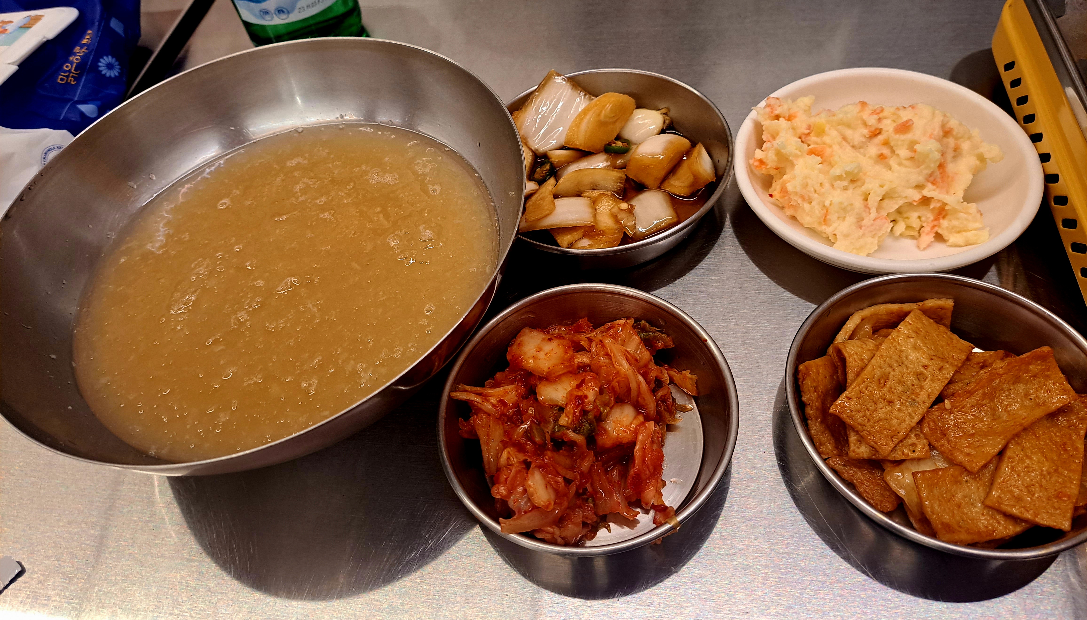 김치, 어묵볶음, 양파장아찌, 감자샐러드와