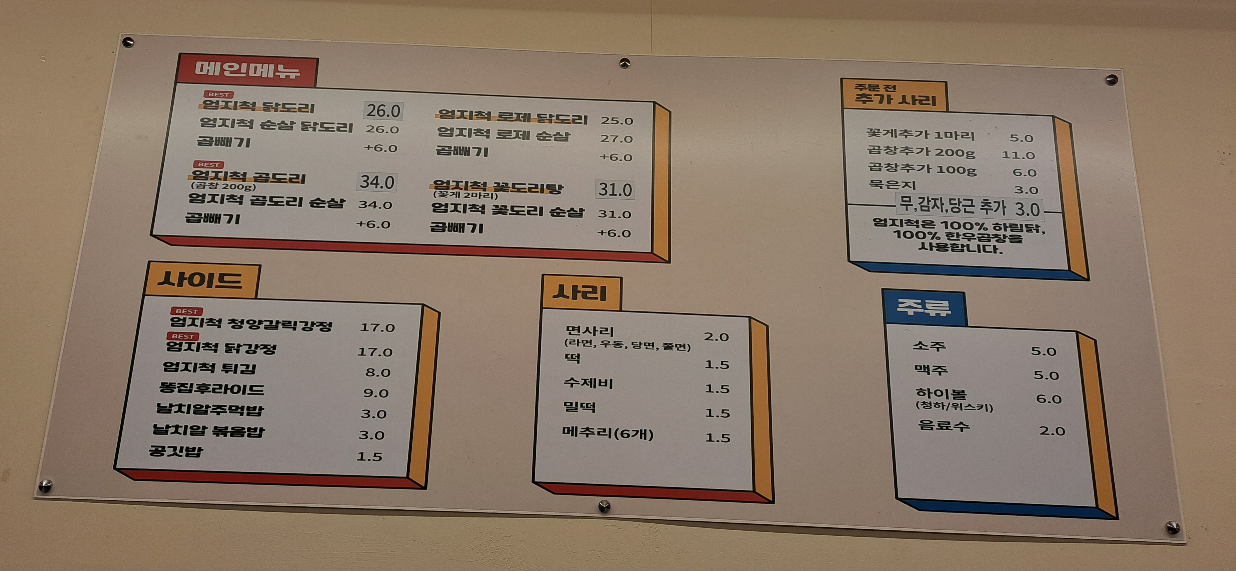 메뉴는 기본 닭도리탕/로제 닭도리탕/곱도리탕/꽃도리탕 등 다양한 닭도리탕들이 있습니다.