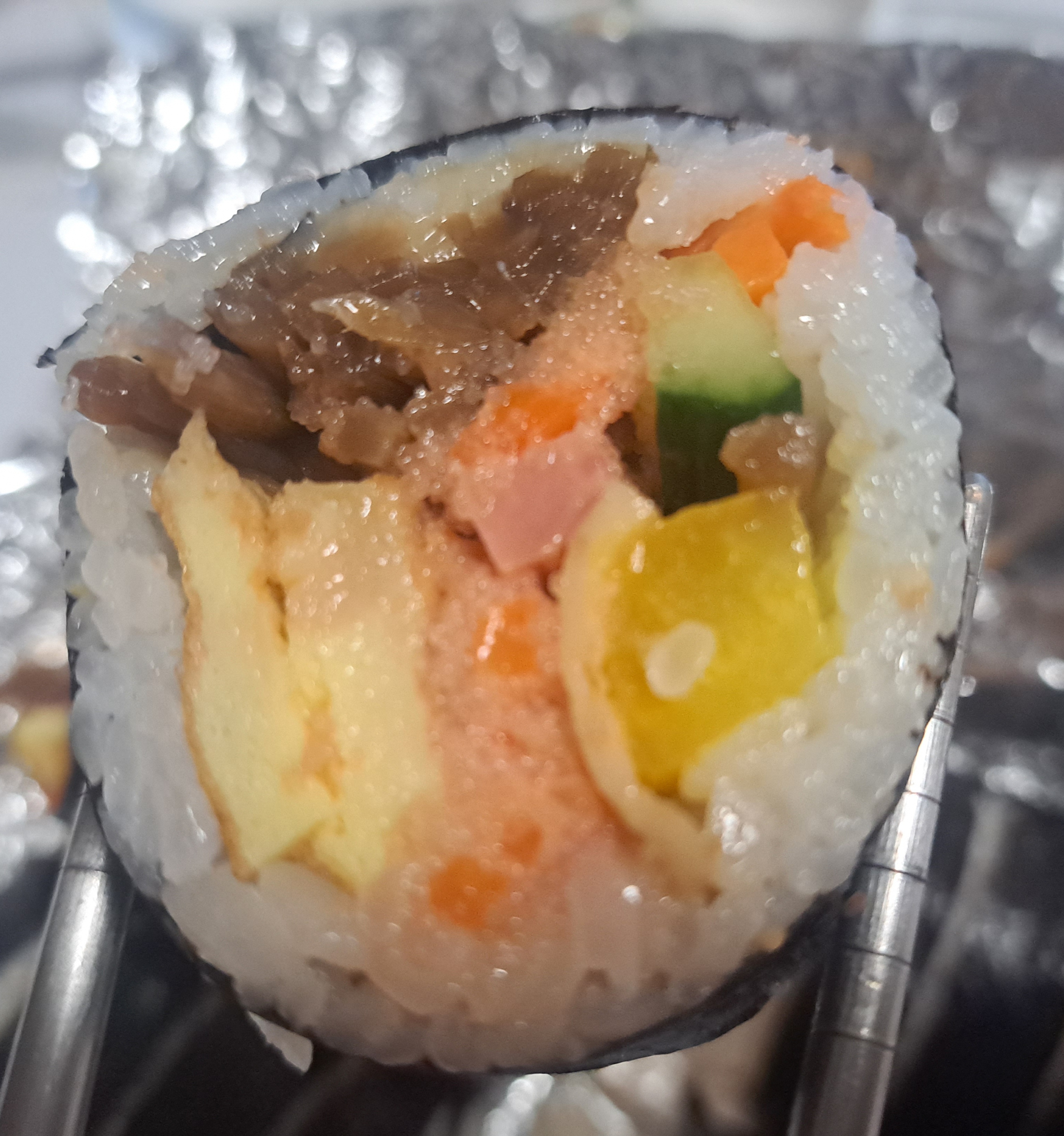 재료는 계란지단 안에 야채들이 들어가 있고 중앙에 햄하나가 끝이지만 고소하면서 담백한 맛이 인생 최애김밥이었습니다.