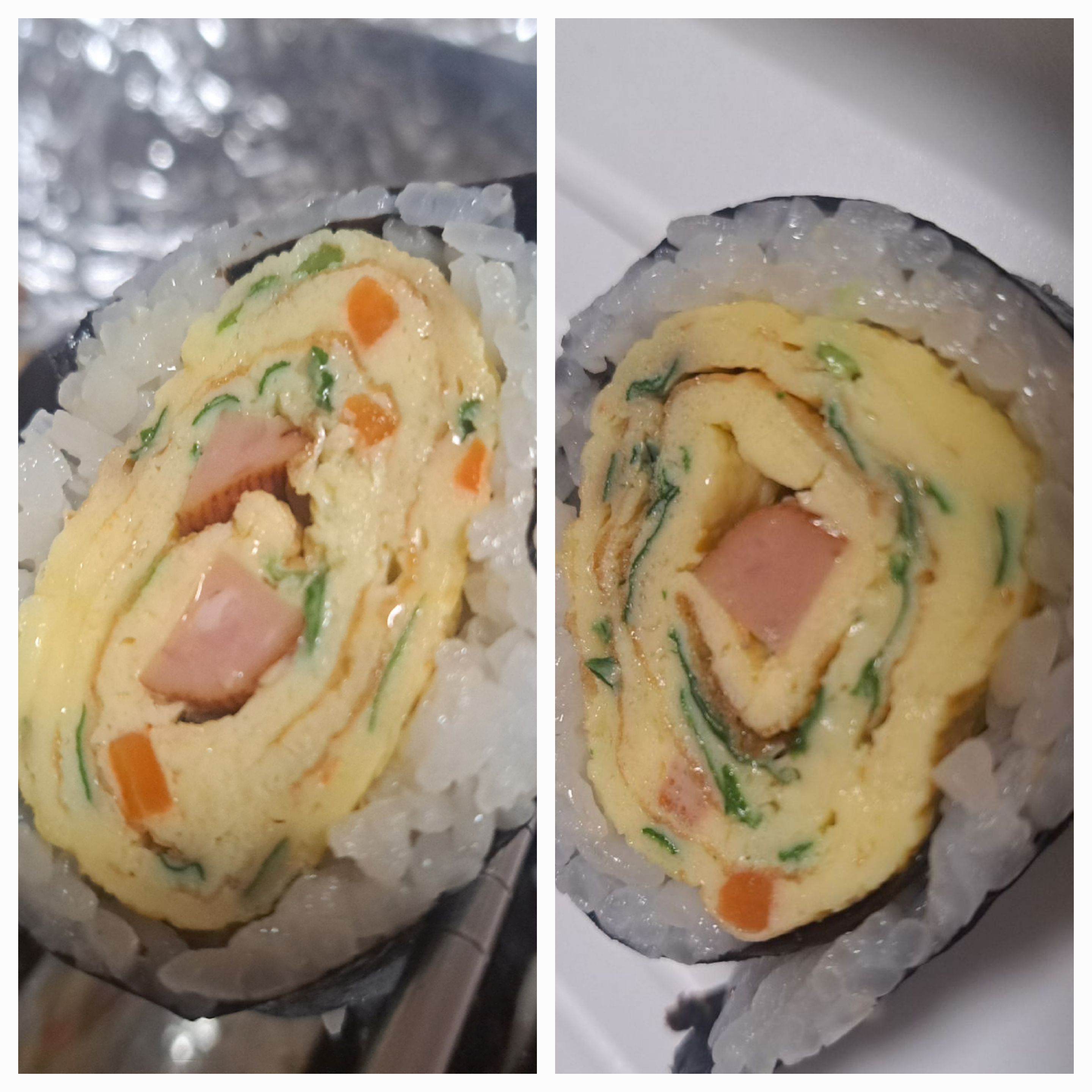 계란말이가 두껍게 통째로 들어간 김밥은 처음 봅니다.