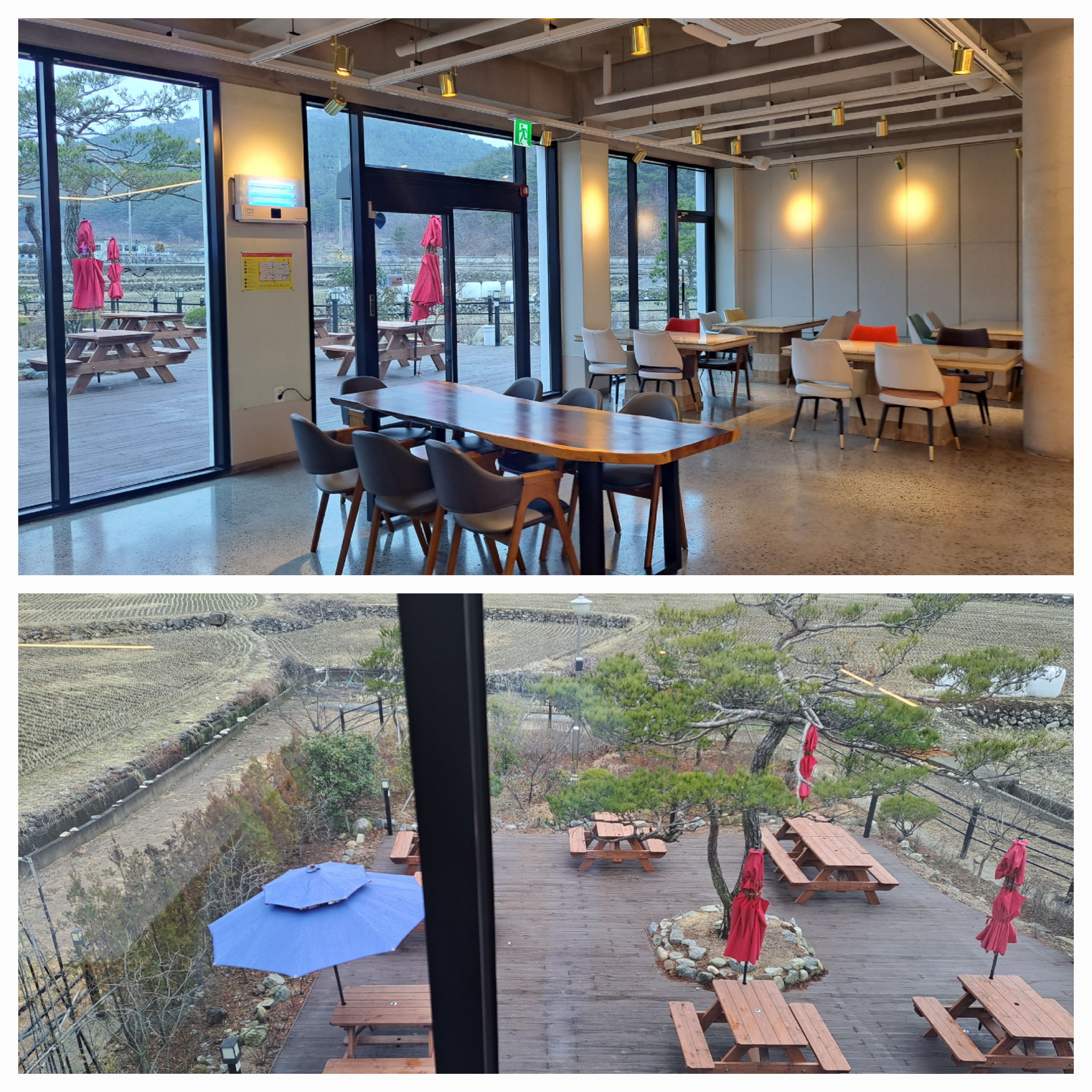 1층에도 앉을 수 있는 테이블이 있고 야외 테이블도 있습니다.
