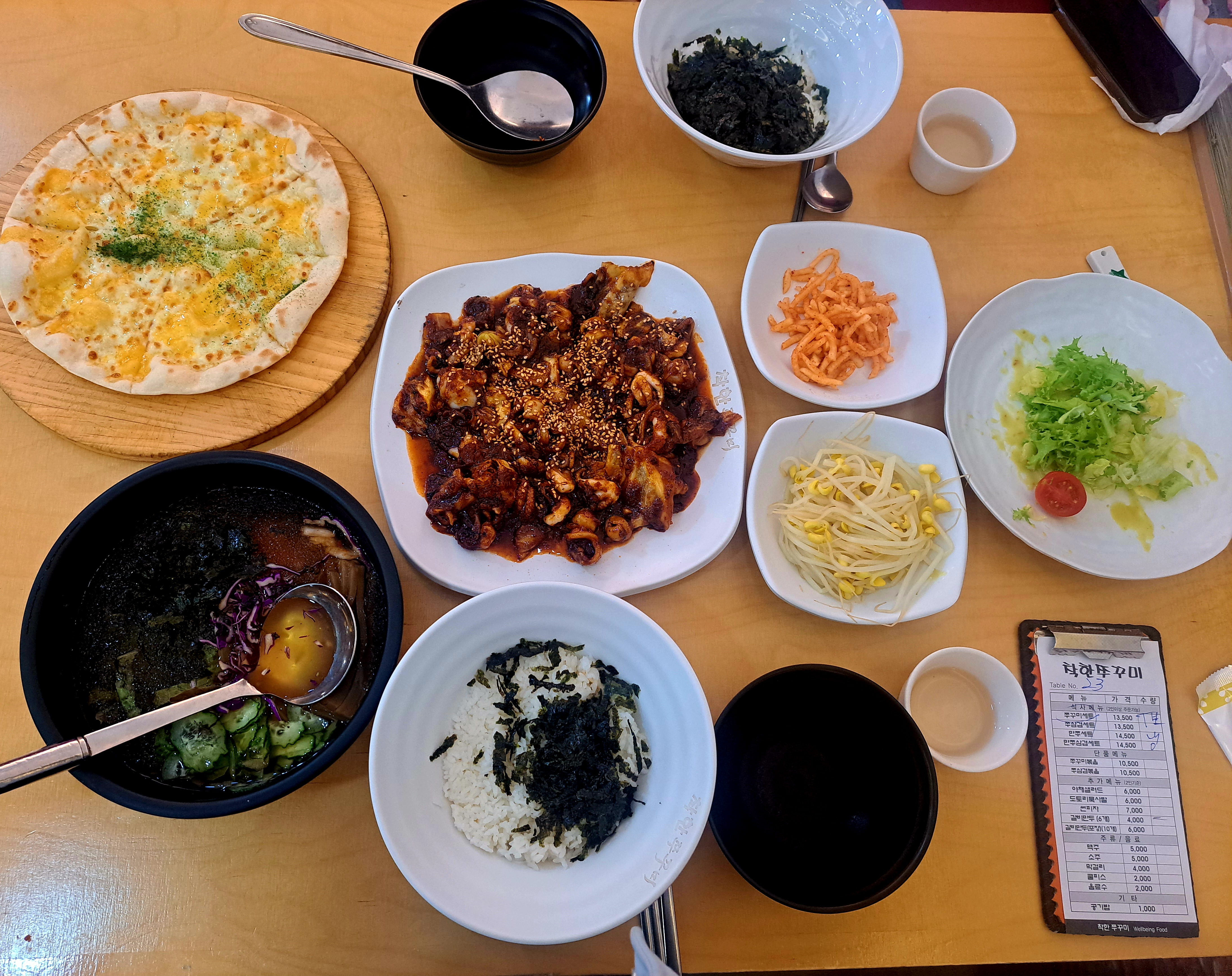 쭈꾸미세트를 시키면 주꾸미, 고르골졸라피자, 야채샐러드,도토리묵사발이 나옵니다.