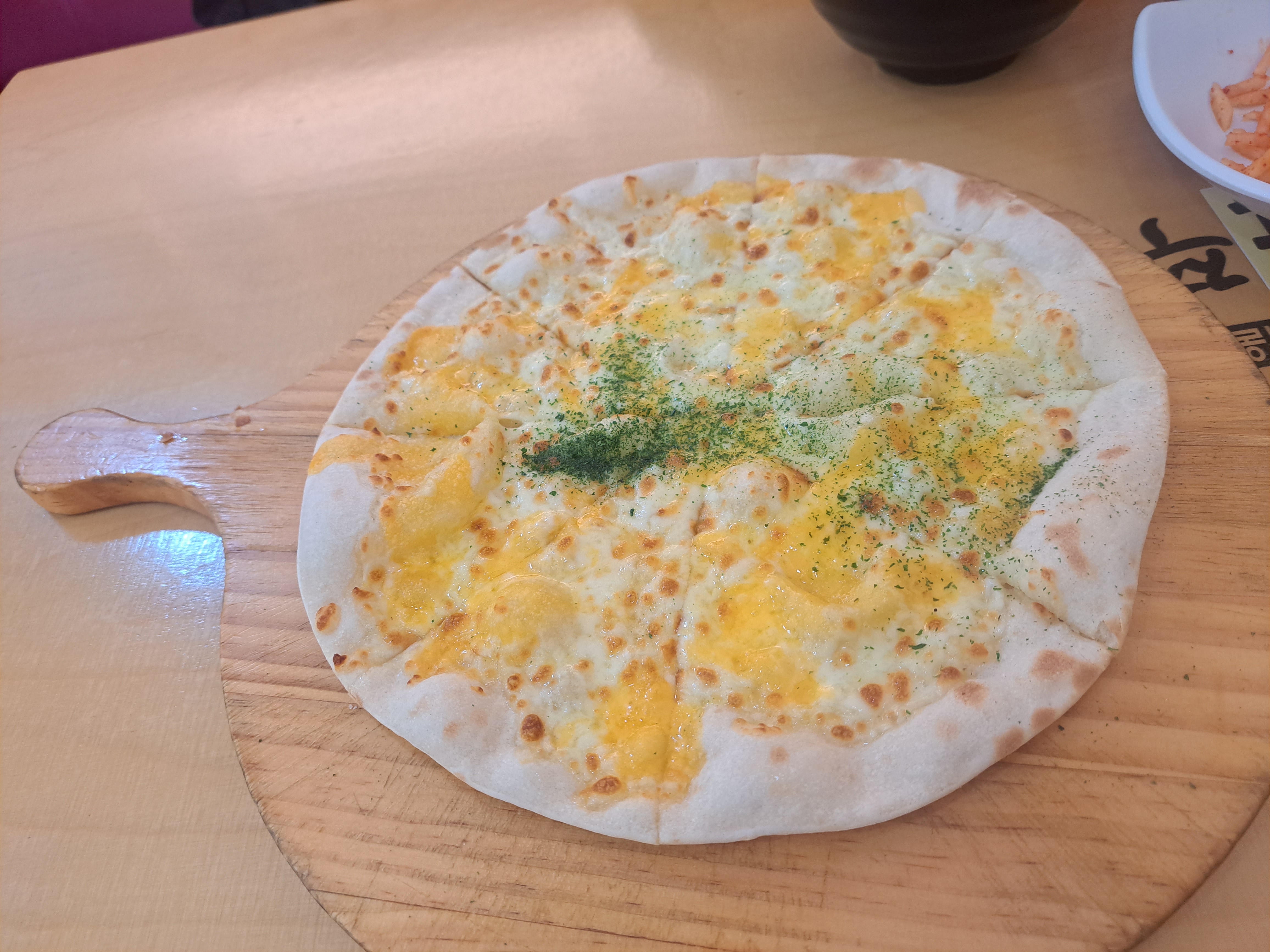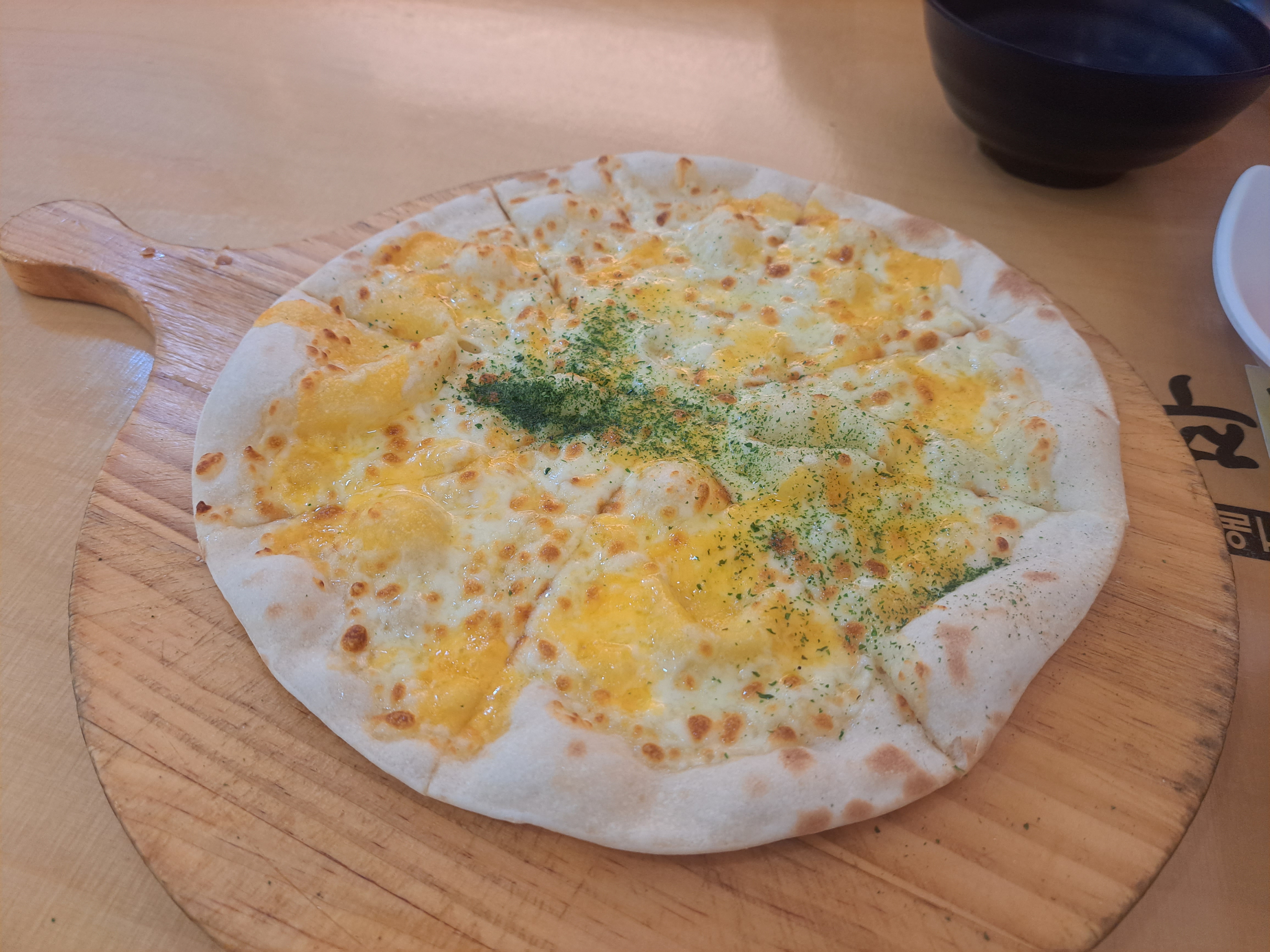 착한 쭈꾸미의 고르곤 졸라 피자는 바싹하게 씬으로 구워진 도우 위에 두 가지의 치즈가 올라가 있어 치즈의 깊은 맛을 느낄 수 있습니다.