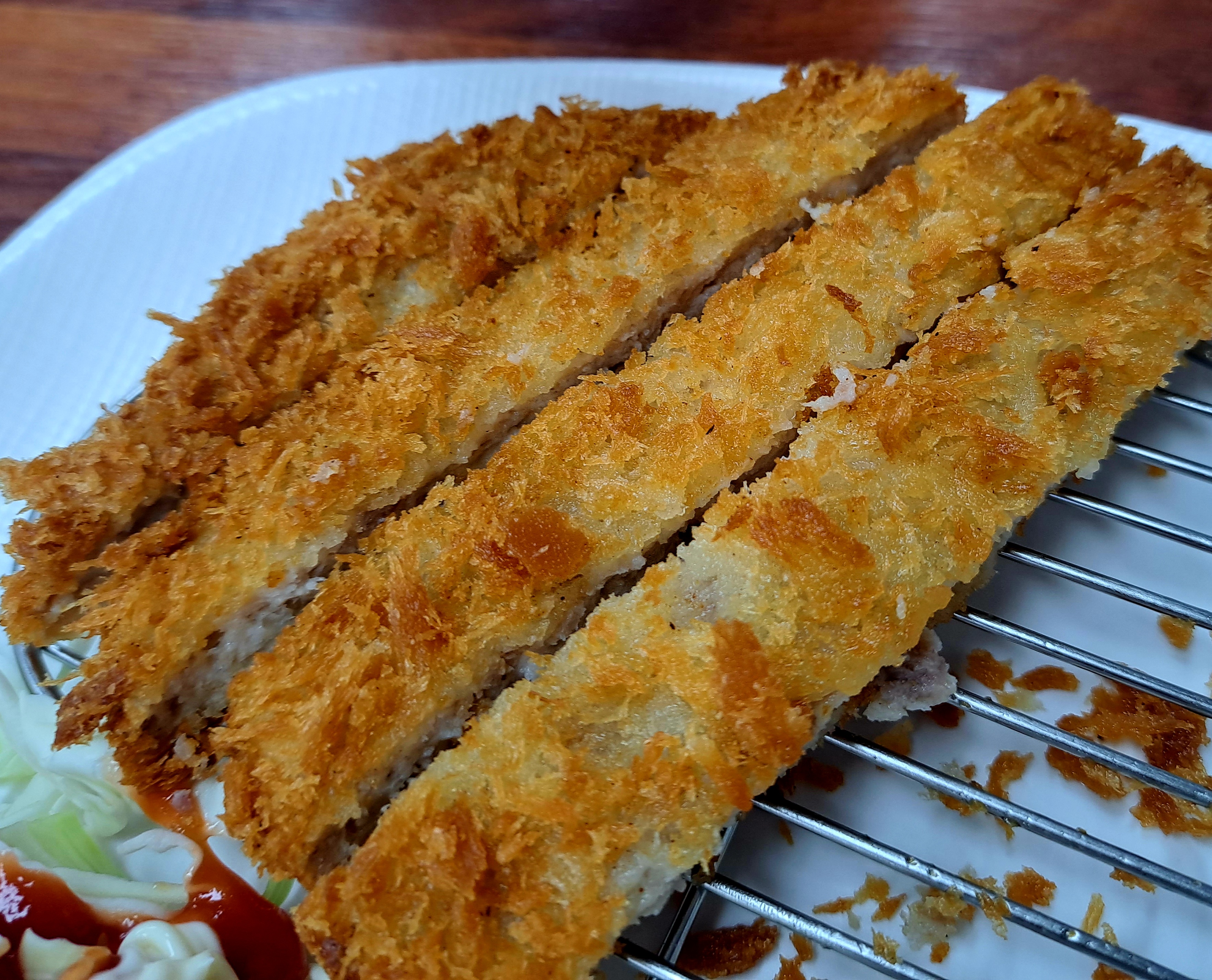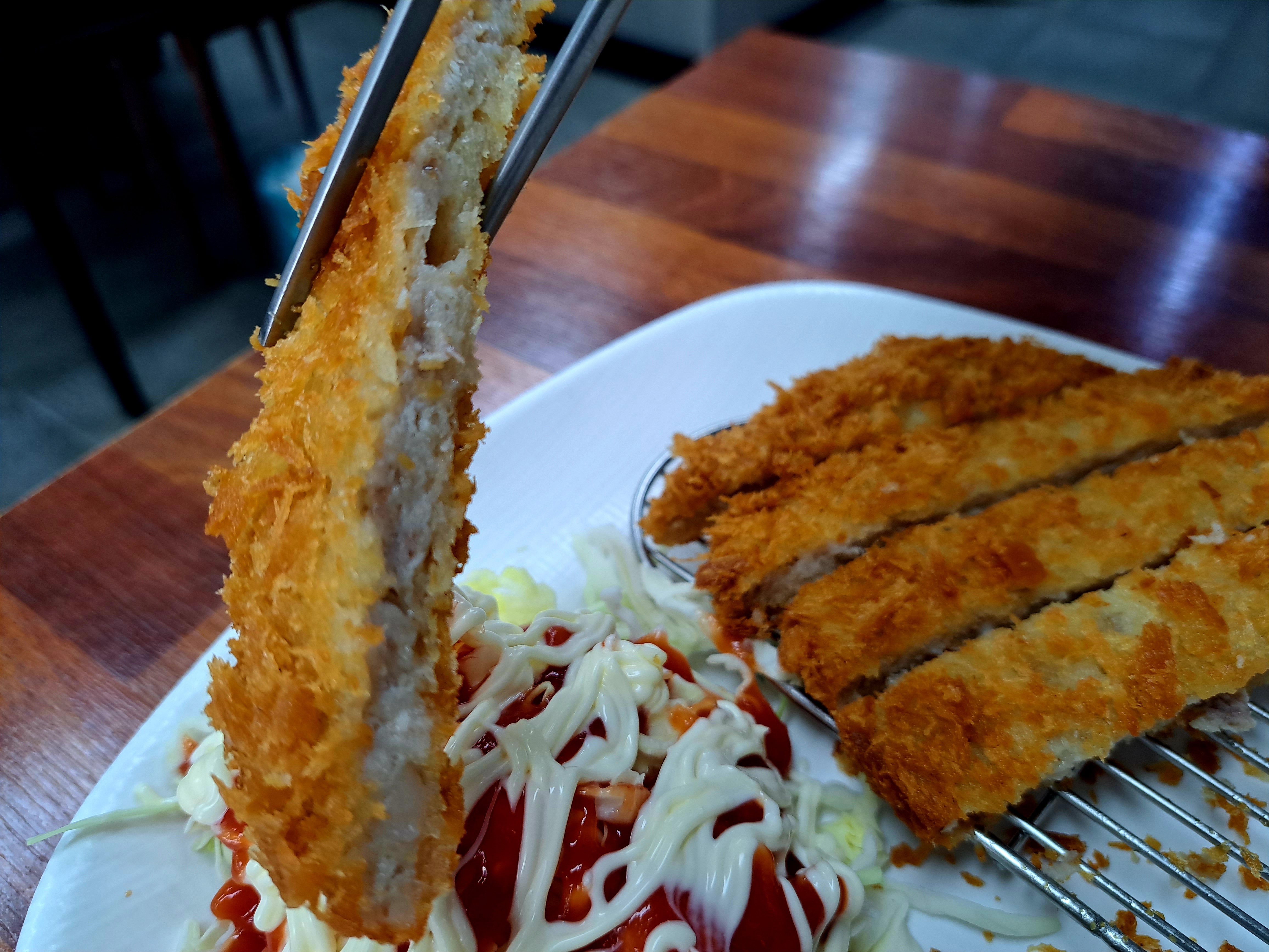 보기만 해도 바삭함이 느껴지는 돈가스는 먹기 좋게 잘라져서 양배추 샐러드와 함께 나옵니다.