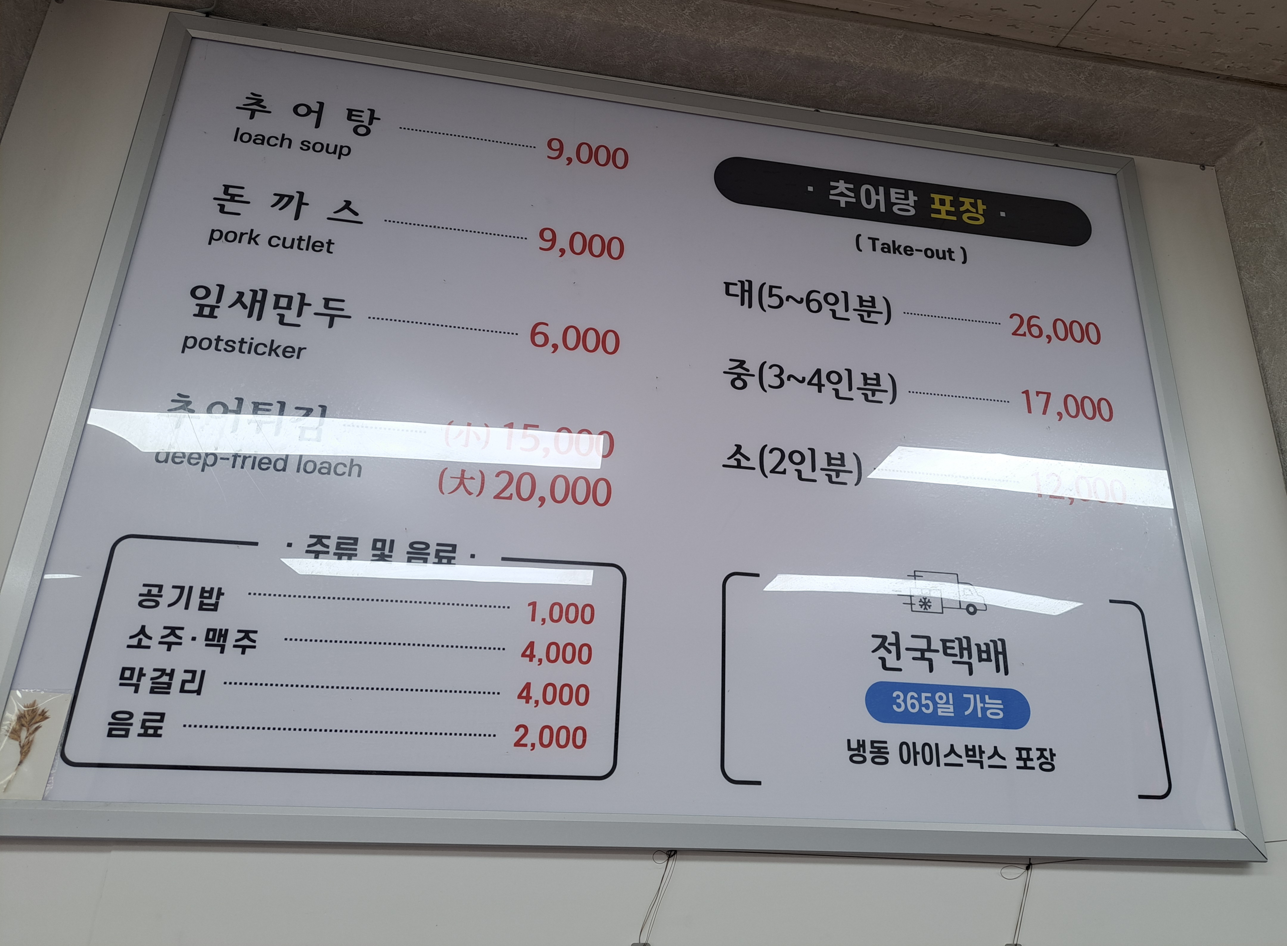추어탕, 돈가스, 잎새만두, 추어튀김 네 가지로 맛집답게 메뉴가 단출합니다.