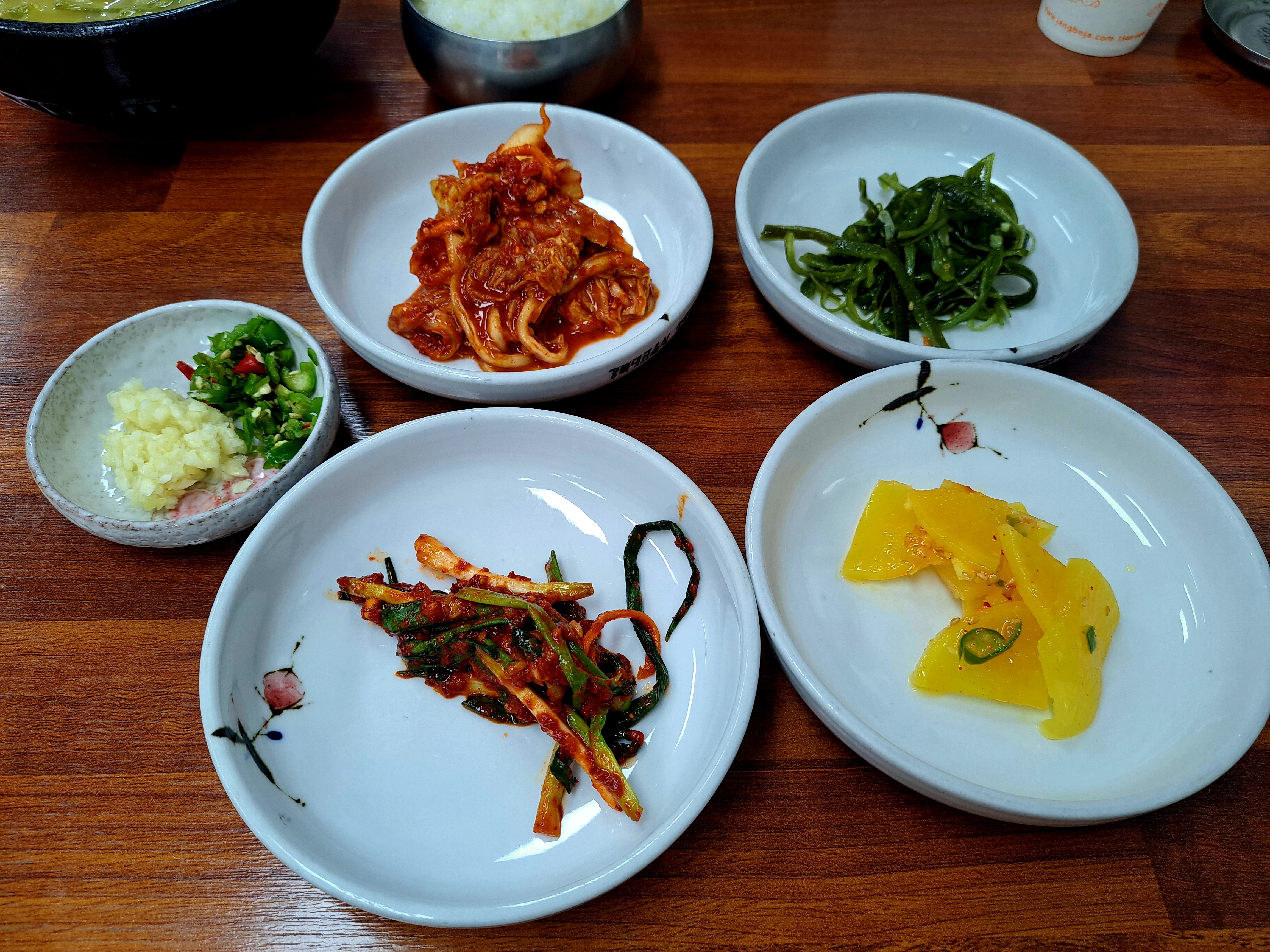김치, 파김치, 단무지, 미역줄거리 볶음, 다진 마늘, 청양고추가 나옵니다.