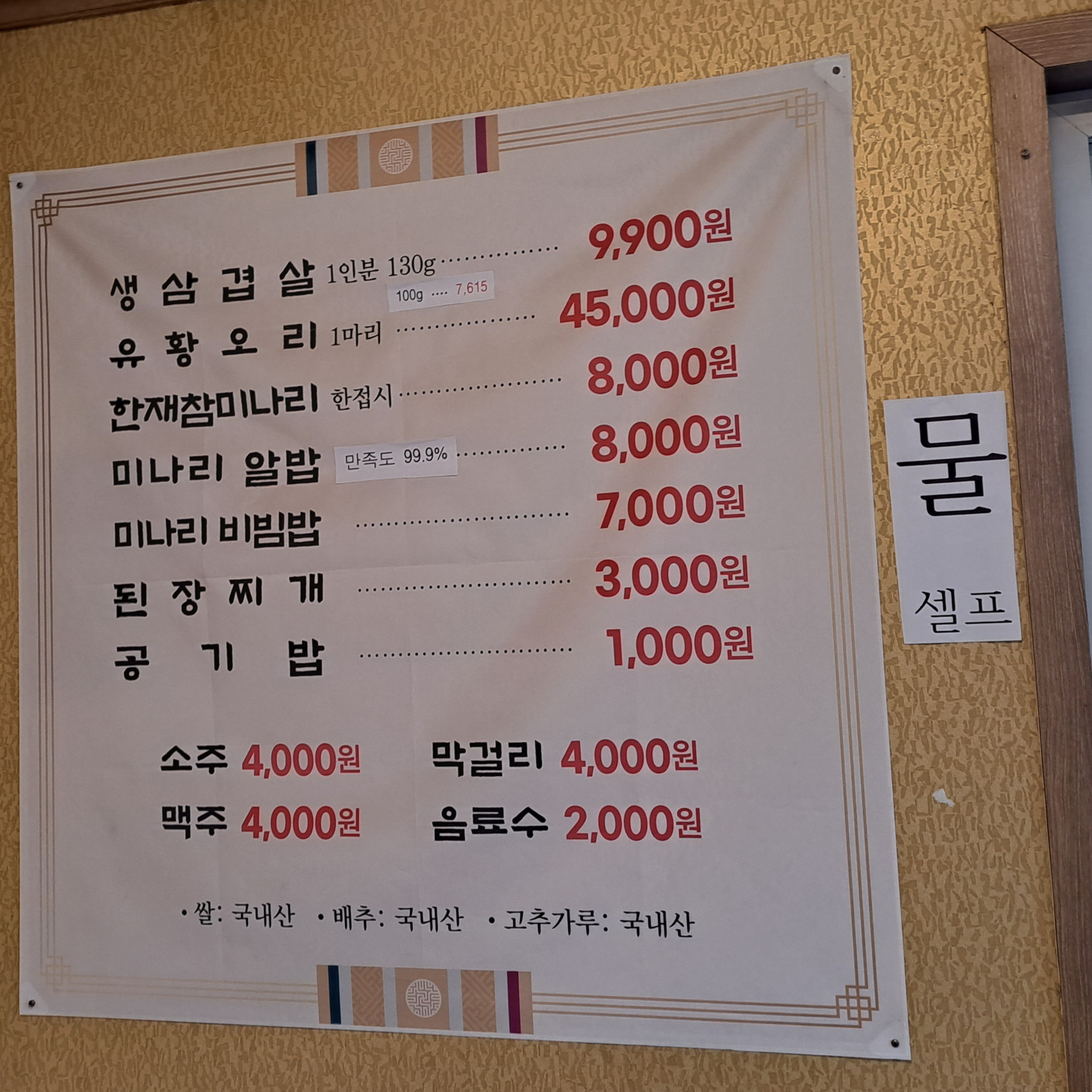 메뉴는 고기류로 생삼겹살/유황오리와 그 외에 한재참미나리, 미나리알밥, 미나리비빔밥, 된장찌개로 단출한 메뉴입니다.