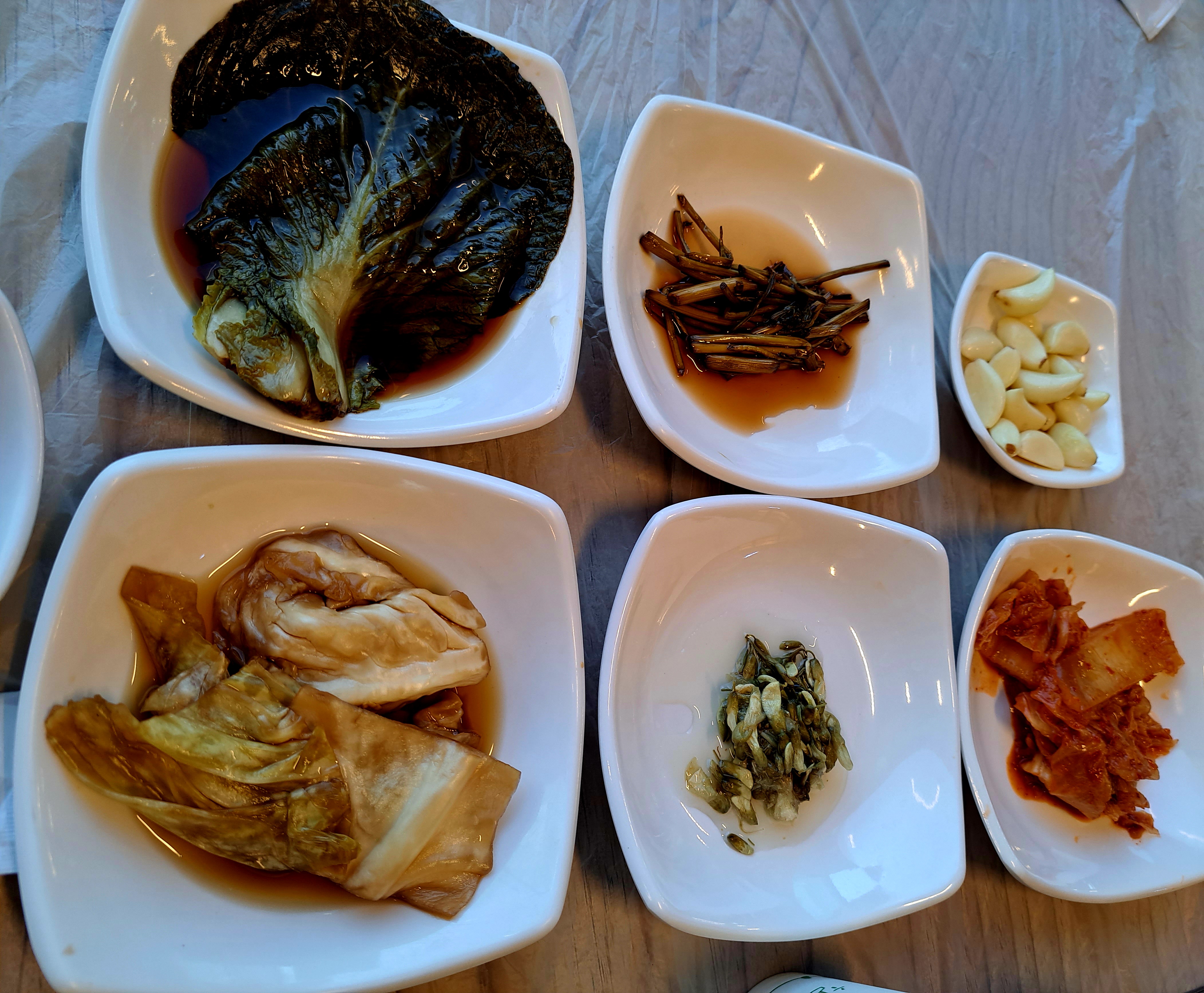 쌈배추, 양배추. 미나리장아찌, 아카시아꽃씨, 마늘등 고기와 함께 먹기 좋은 반찬들이 나옵니다.