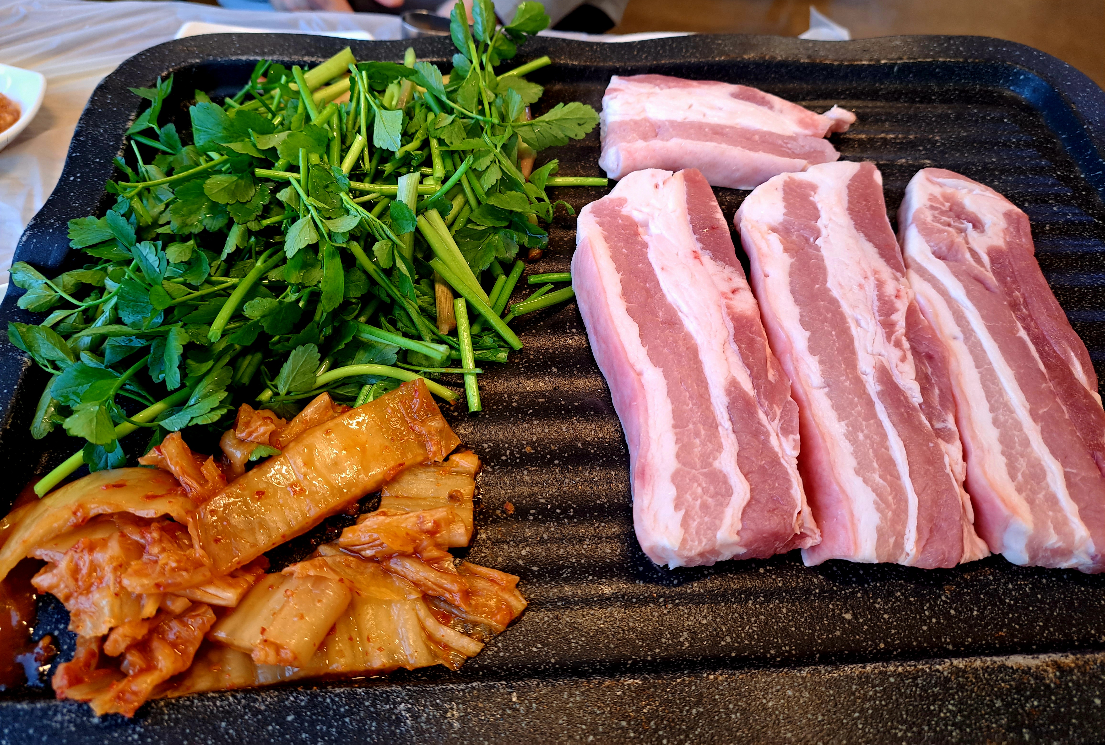 불판이 달궈지면 삼겹살과 한재 미나리를 먹기좋게 잘라서 김치와 올립니다.