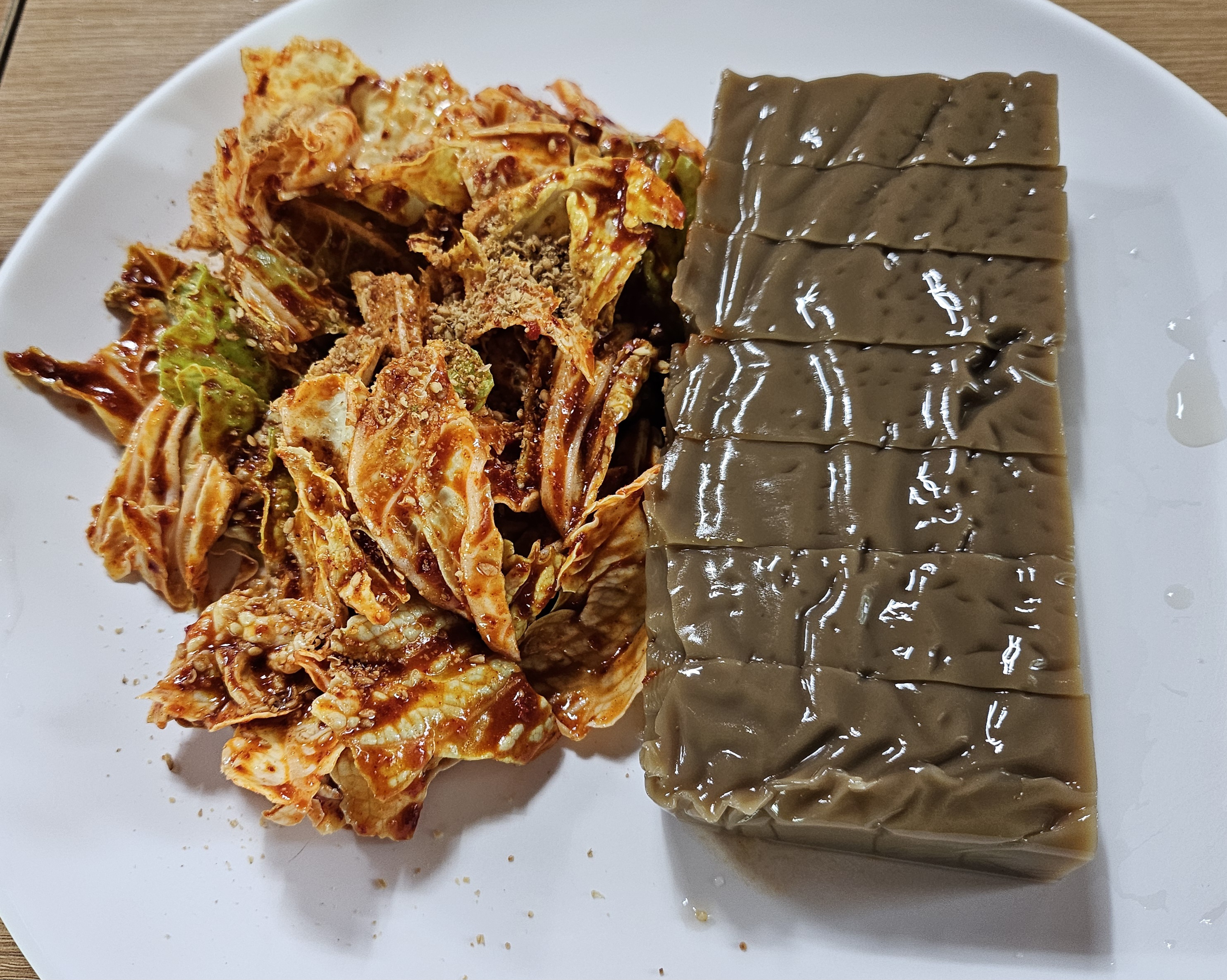금방 만든 아삭한 겉절이와 탱글탱글 도토리묵은 국수와 함께 먹기 좋은 음식입니다.