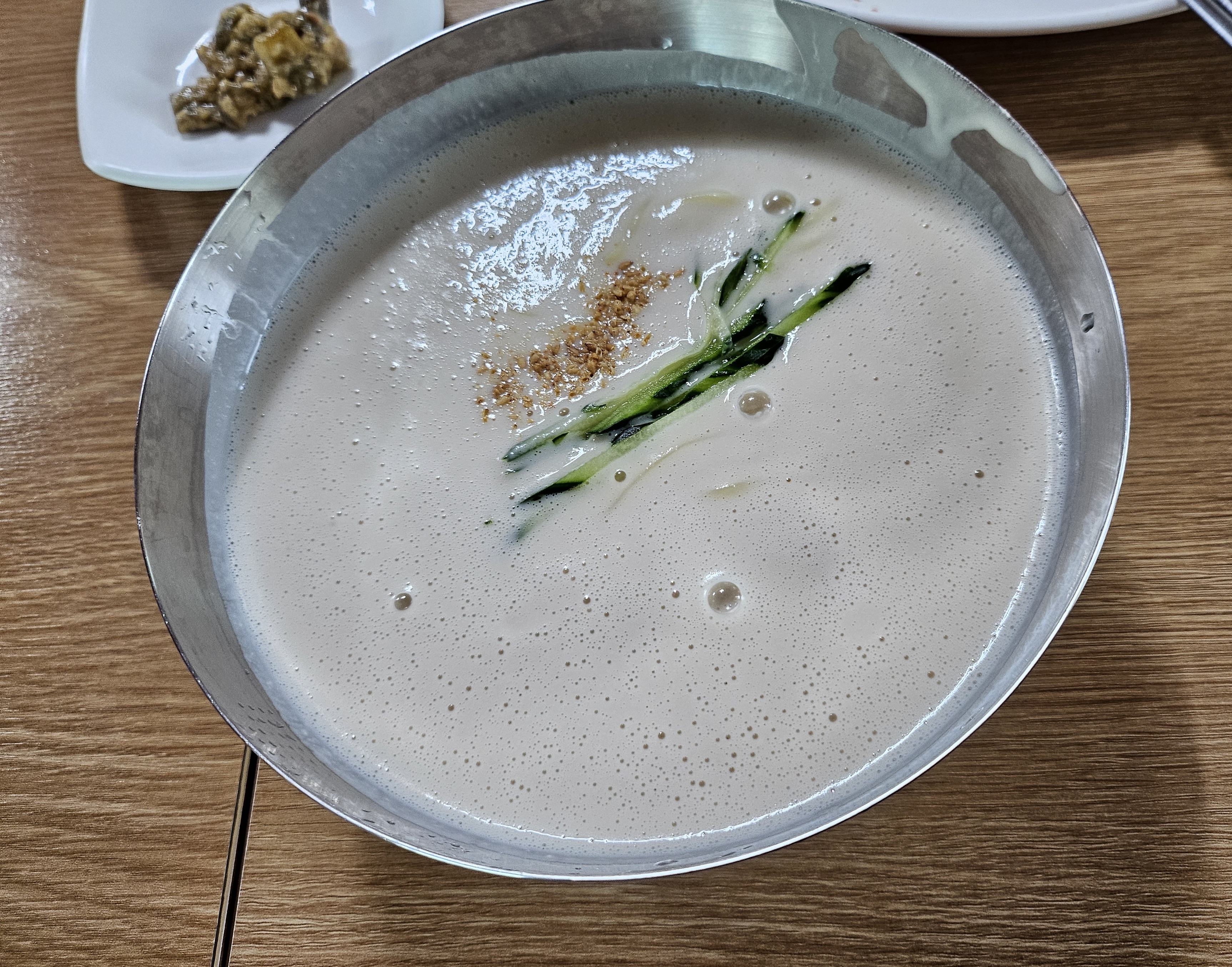 곱게 갈린 콩물에 오이와 깨소금이 올라가 있습니다.