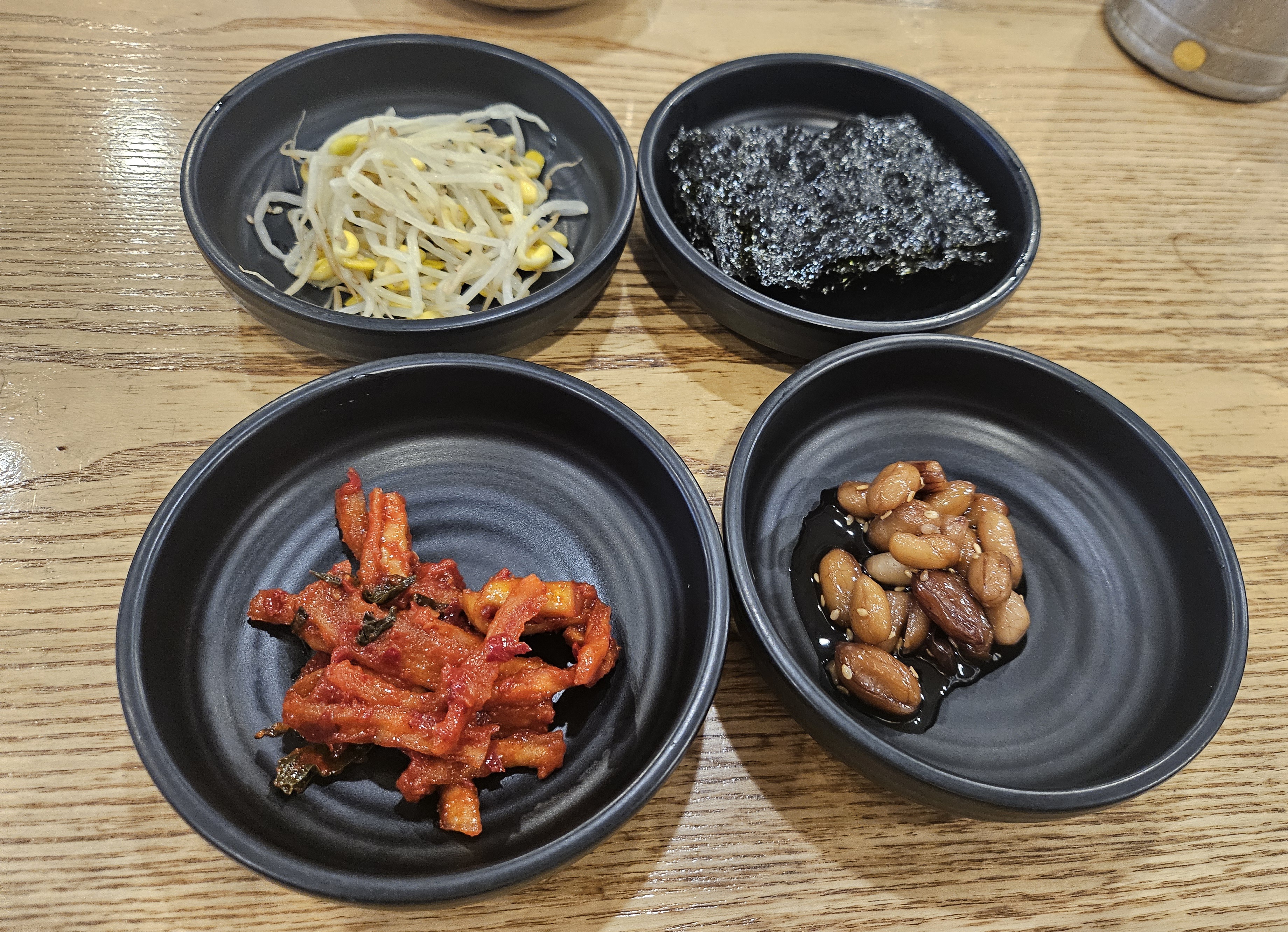 콩나물 무침, 김구이, 무우 말랭이, 땅콩조림과 콩나물국이 나옵니다.
