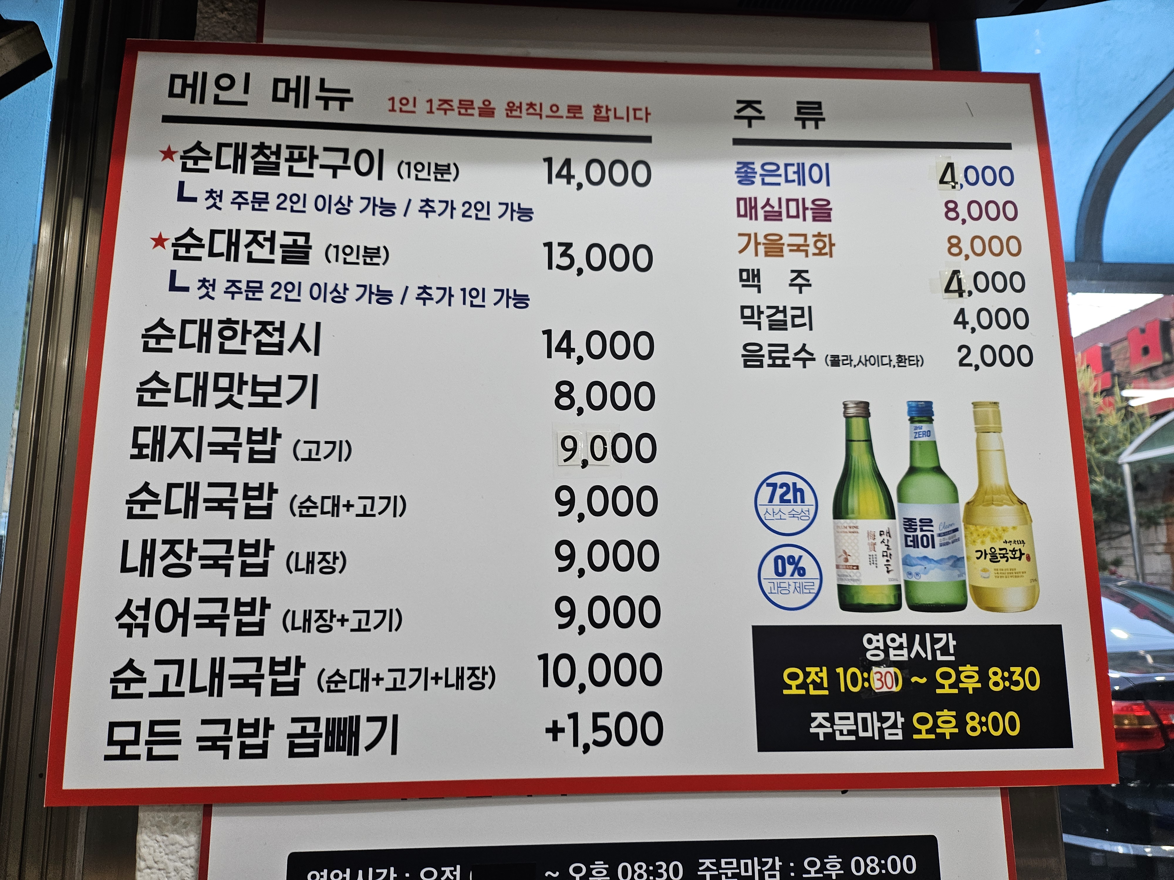 순대철판구이와 순대전골은 첫 주문 2인 이상부터 가능합니다.