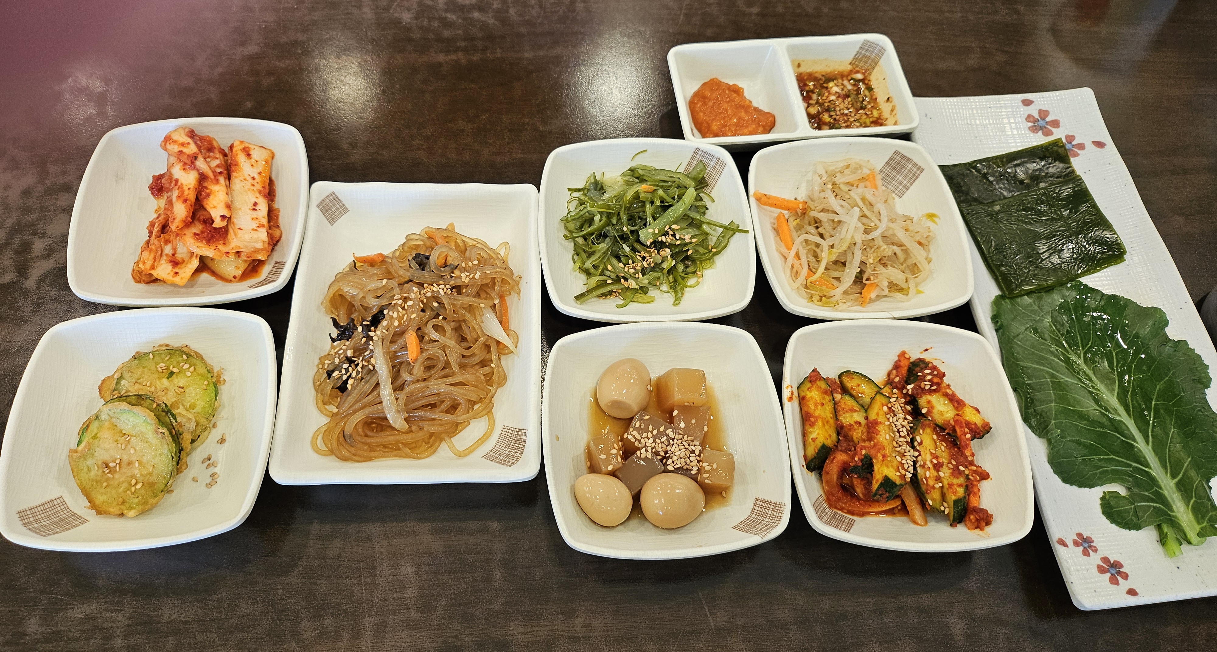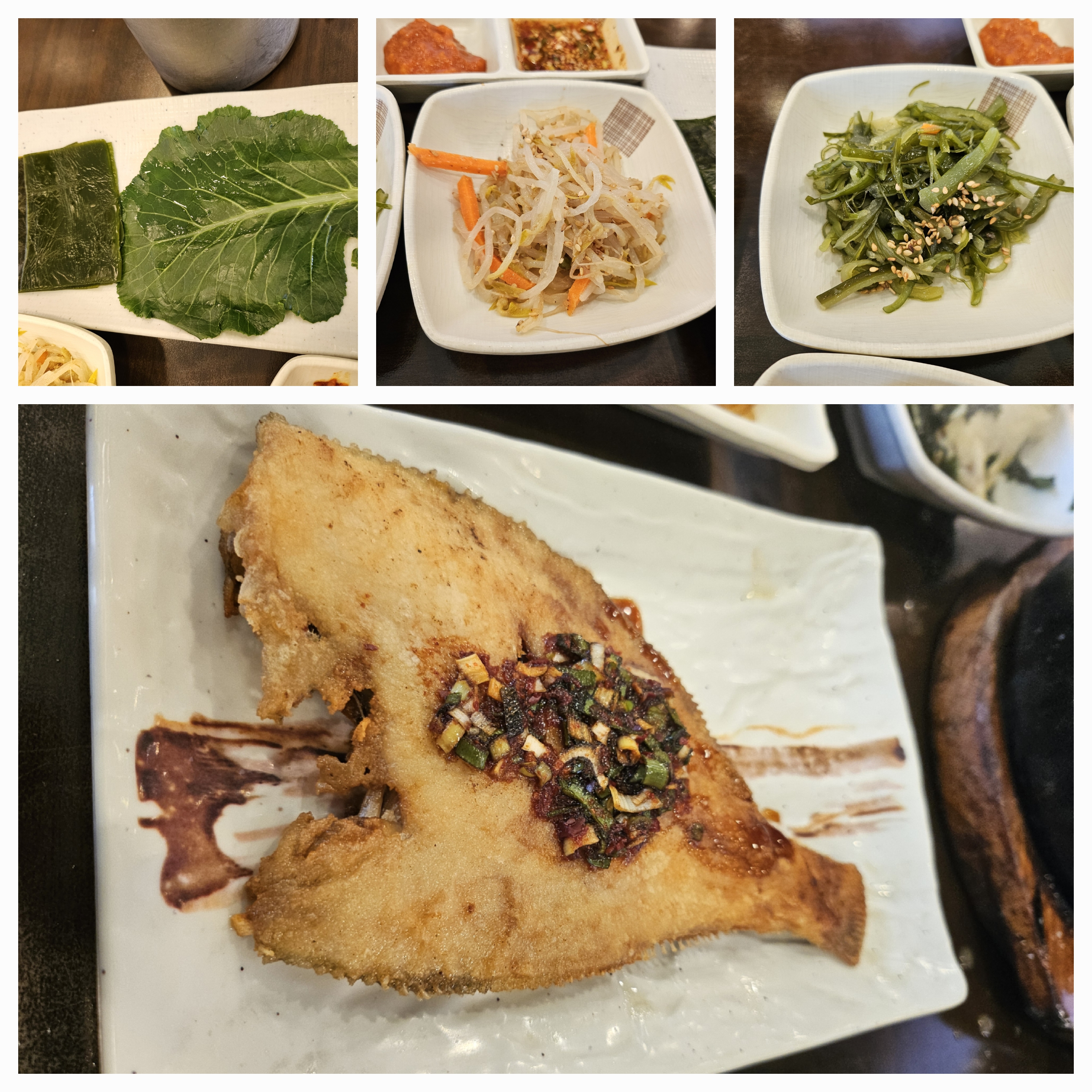 호박전, 김치, 잡채, 오이무침, 숙주나물, 장조림, 쌈, 가자미튀김 등이 푸짐한 한상이 나옵니다.