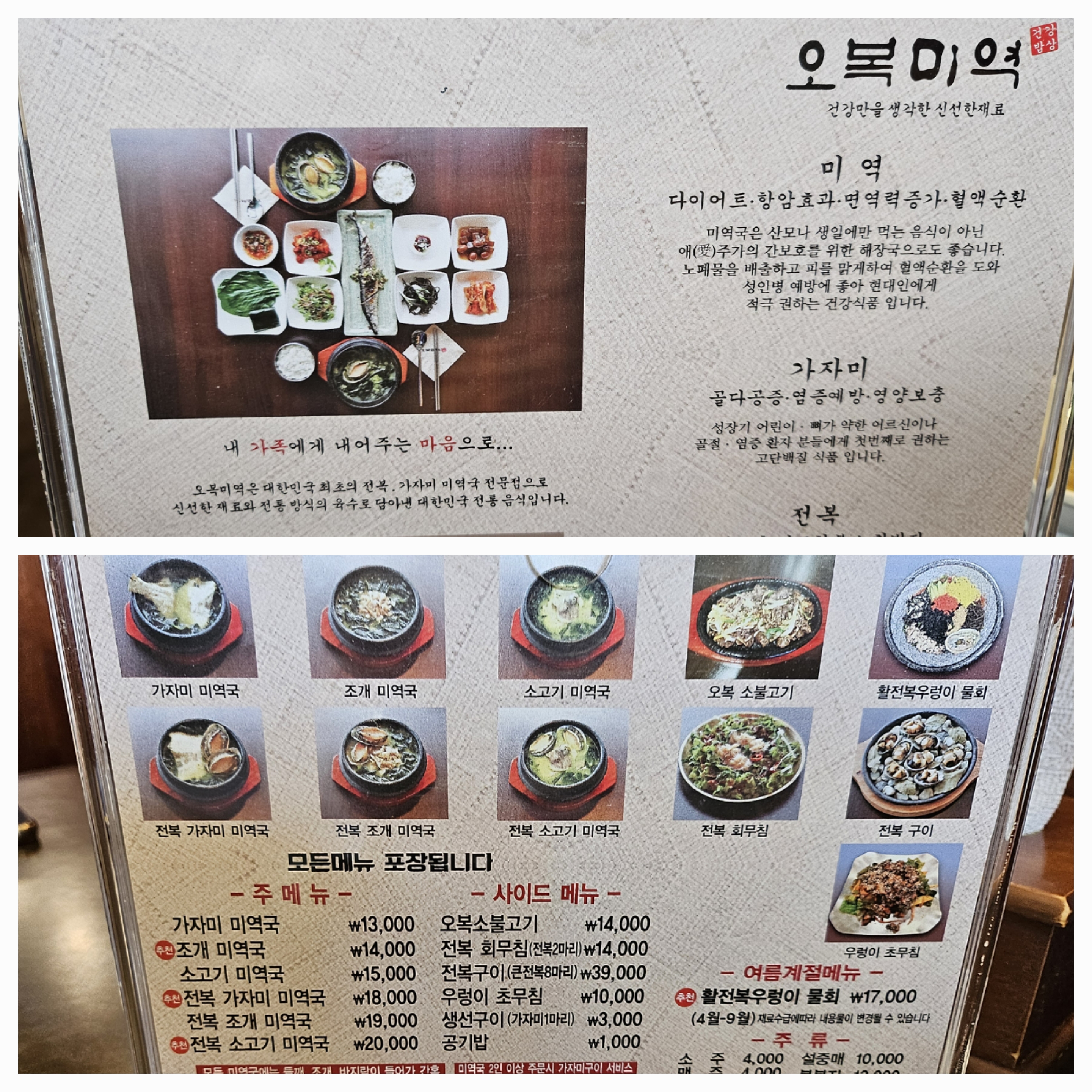 오복미역의 메뉴입니다.