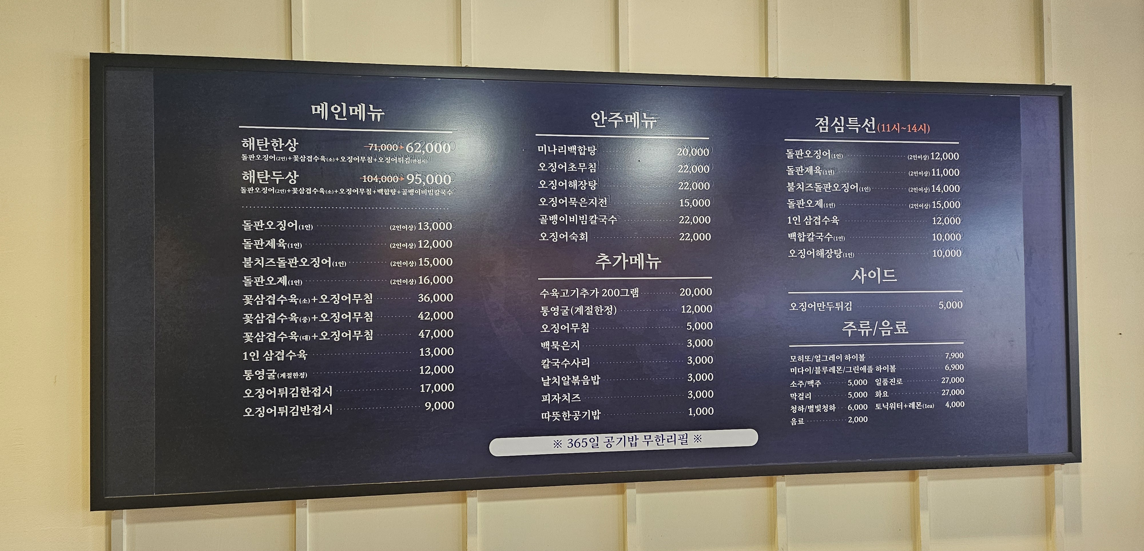 메인 세트메뉴 외에 정말 다양한 오징어 요리들과 안주메뉴/사이드 메뉴들이 있습니다.