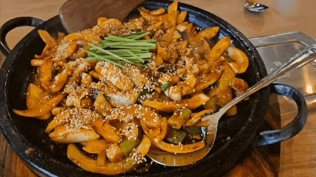 지글지글 돌판 위에 먹음직스러운 비주얼의 돌판 오징어입니다.