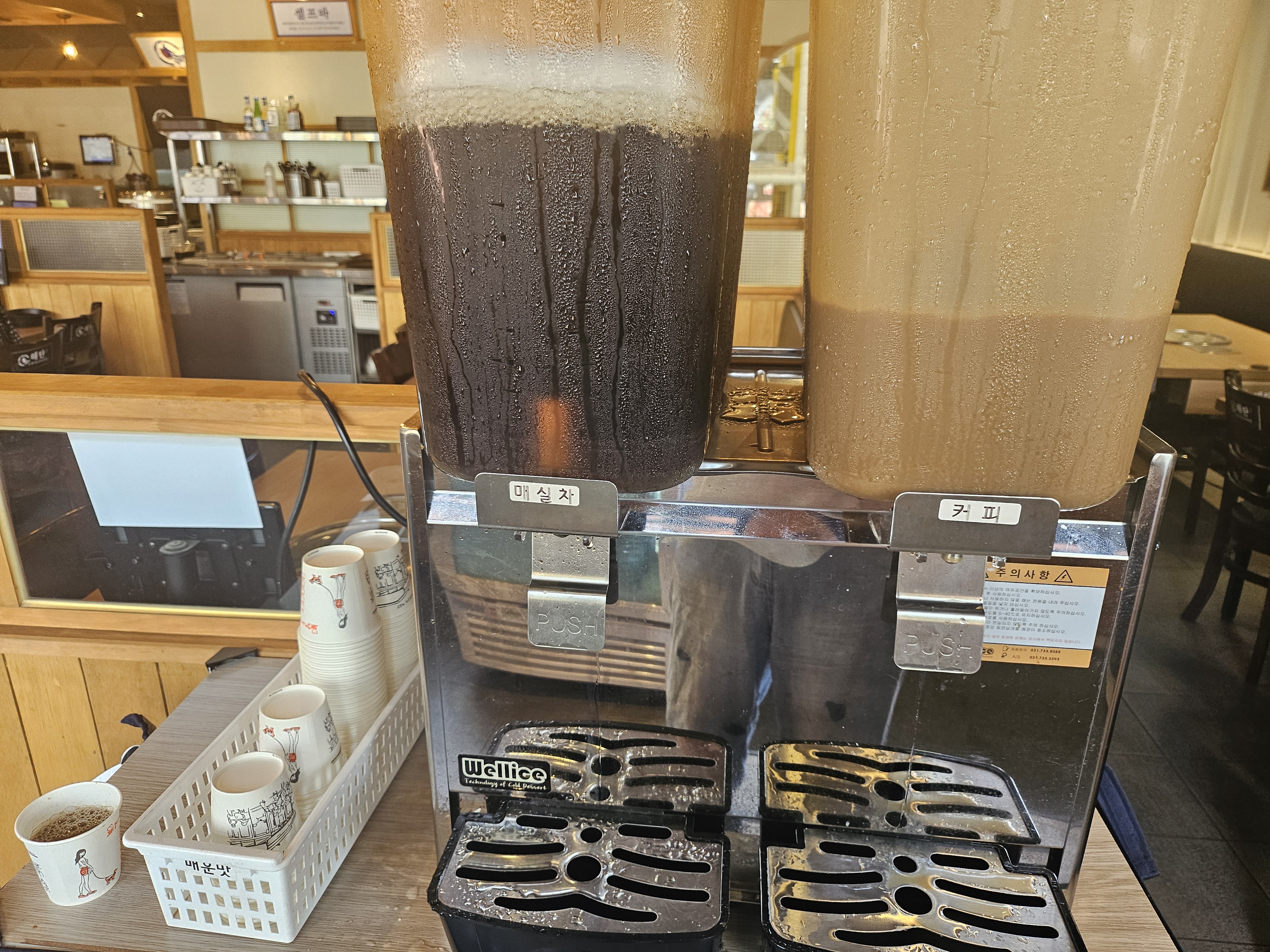 계산대 옆에는 매실차와 시원한 커피도 준비돼서 있습니다.